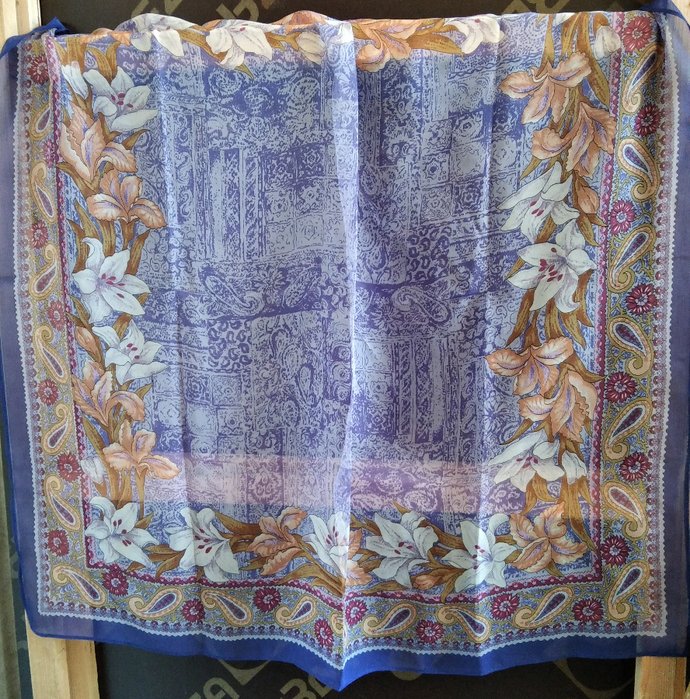 Мне очень понравился платочек Т. Сухаревской. Свежий, сочный, натуральные оттенки! Говорят, что "летний", но думаю и зимой будет актуален. Ткань тонкая. Комфортный, легко драпируется. Шерстяная бахрома утяжеляет немного такую ткань и рисунок--можно переделать на длинную ,"шелковую".