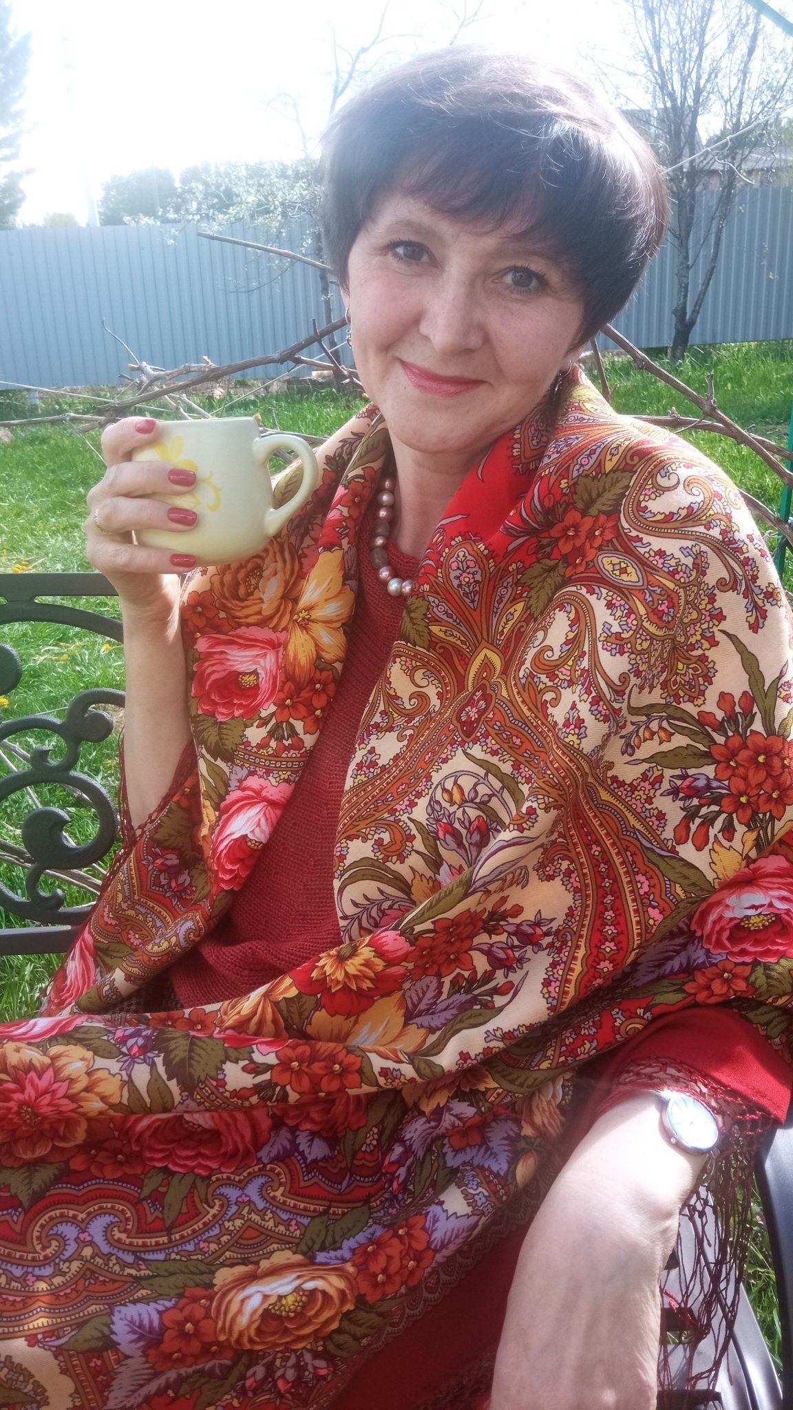 Вчерашнее полуденное солце сильно приукрасило шаль, на самом деле она не такая алая!