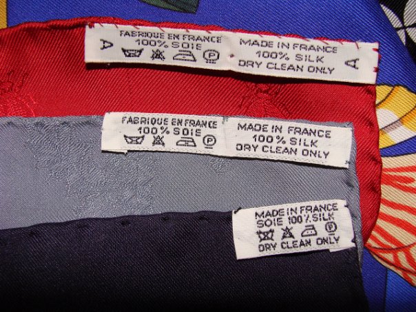 По ссылке выше мои платки. На красном этикетка мною лично дополнительно пришита ещё косыми стежками. Это я зря сделала. На данный момент я их вообще спорола, белые они, большие, всё время как бельмо выворачиваются на видное место. У новых не спарывала, ибо новые этикетки меньше по размеру и тёмные на тёмных каре. Эти белые делали до 2003 года.