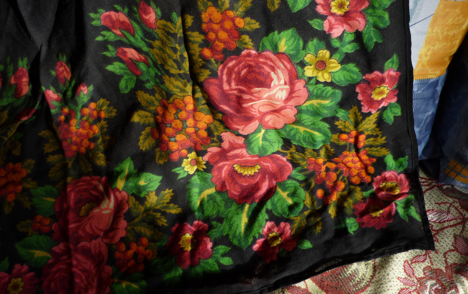Iра81, очень интересный и красивый платок! Какого он размера? Очень понравилось (особенно это заметно на первой фотографии), что при всей традиционности расцветки платок хоть и выдержан в павловопосадском колорите (черный фон-розовые-красные цветы-зеленые листья), но нет крикливости, ядрености, схематичности в цветах. Очень светится роза на первой фотографии, почему-то при взгляде на Ваш платок в памяти всплывают жостовские подносы.
