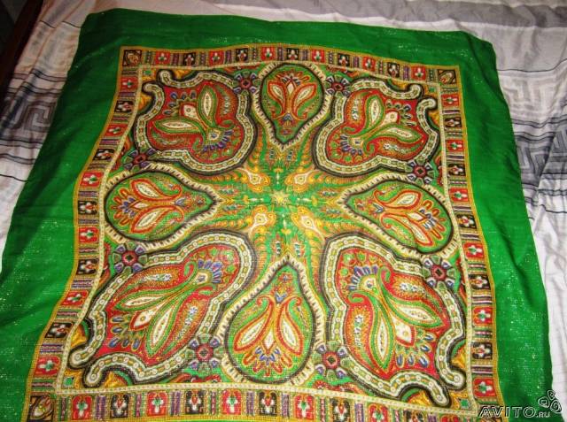 автор пишет:"платок шерстяной тонкий с золотым рюлексом,на втором фото даже покрывало просвечивается ,очень красивый из старых запасов,похож на павлово посадский ,но это Япония.Преобретен во времена СССР. Размер платка 75х75 см.В жизни выглядит шикарно.Очень насыщенные краски.Никто не носил.Состояние новое.".