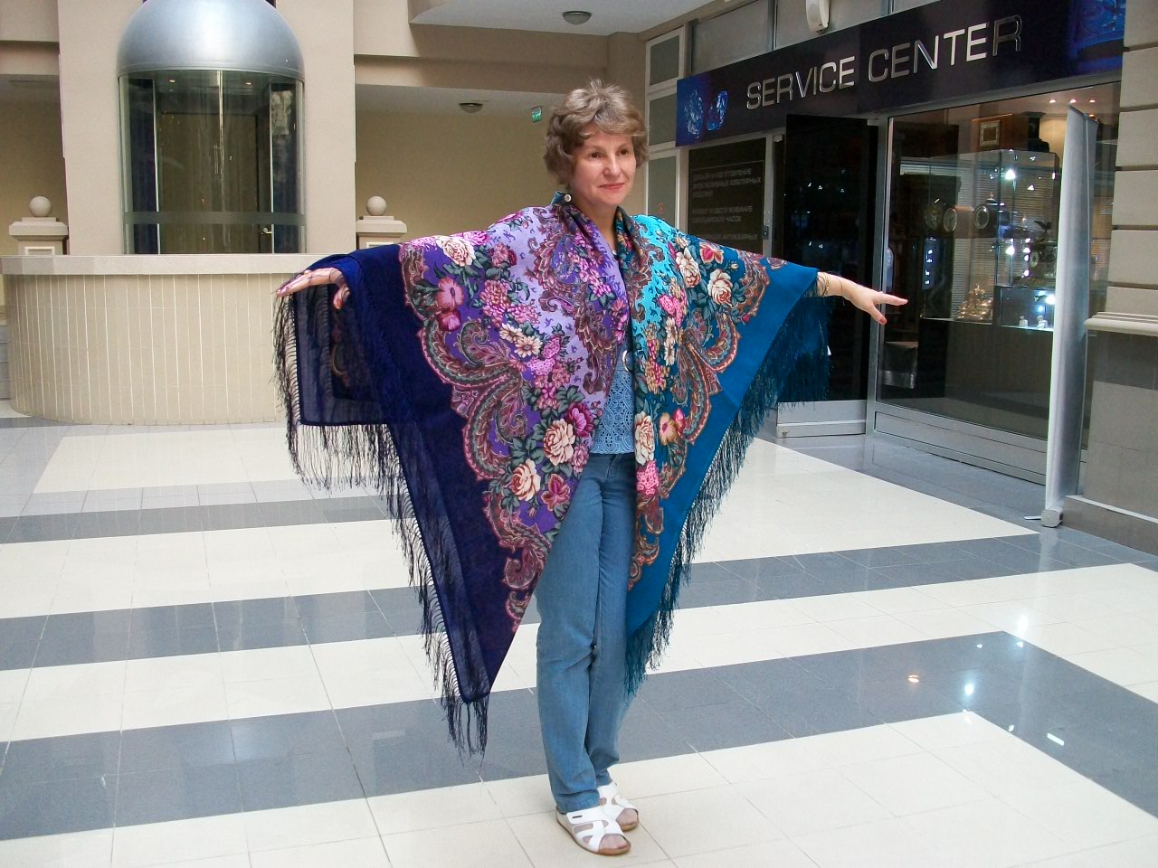 Ева, жаль что мало показываетесь, очень красивое сочетание платья и платка!