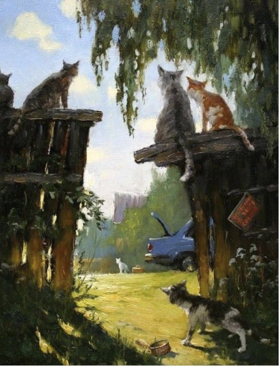 Понравилась картина с городским котом и котами и часами