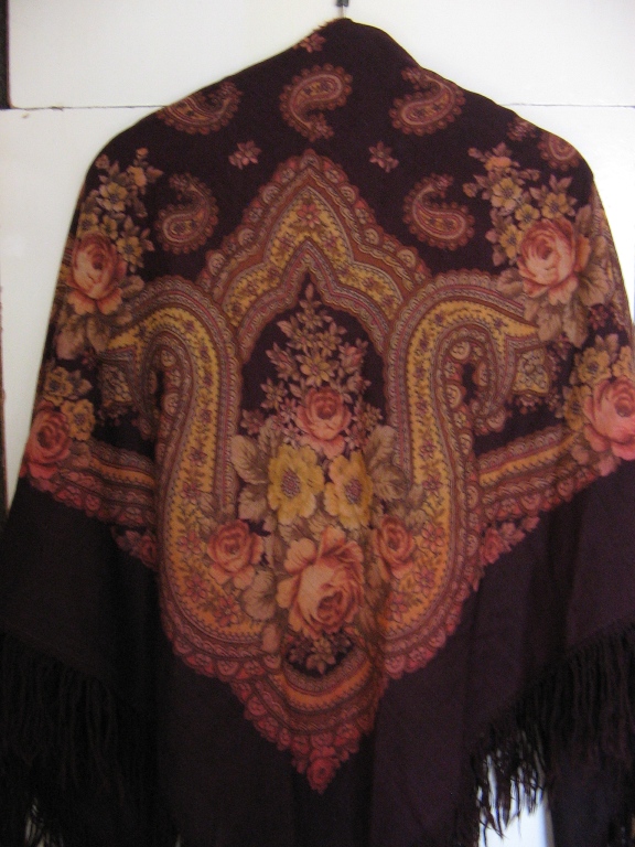 Дорогие форумчанки! У моей коллеги по работе нашелся вот такой платок. По виду он павловопосадский. А вот, когда сделан, неизвестно. Его нашли в сундуке у бабушки, хотели выбросить. Чудом оставили. Состояние его аховое: несколько дырок, цвета слиняли. Но рисунок по-прежнему красив. Цвет фона и каймы темно-вишневый. Бахрома у него шерстяная. Размер: 123х123. Очень хотелось бы знать его название и автора, примерный возраст. Помогите, пожалуйста!
