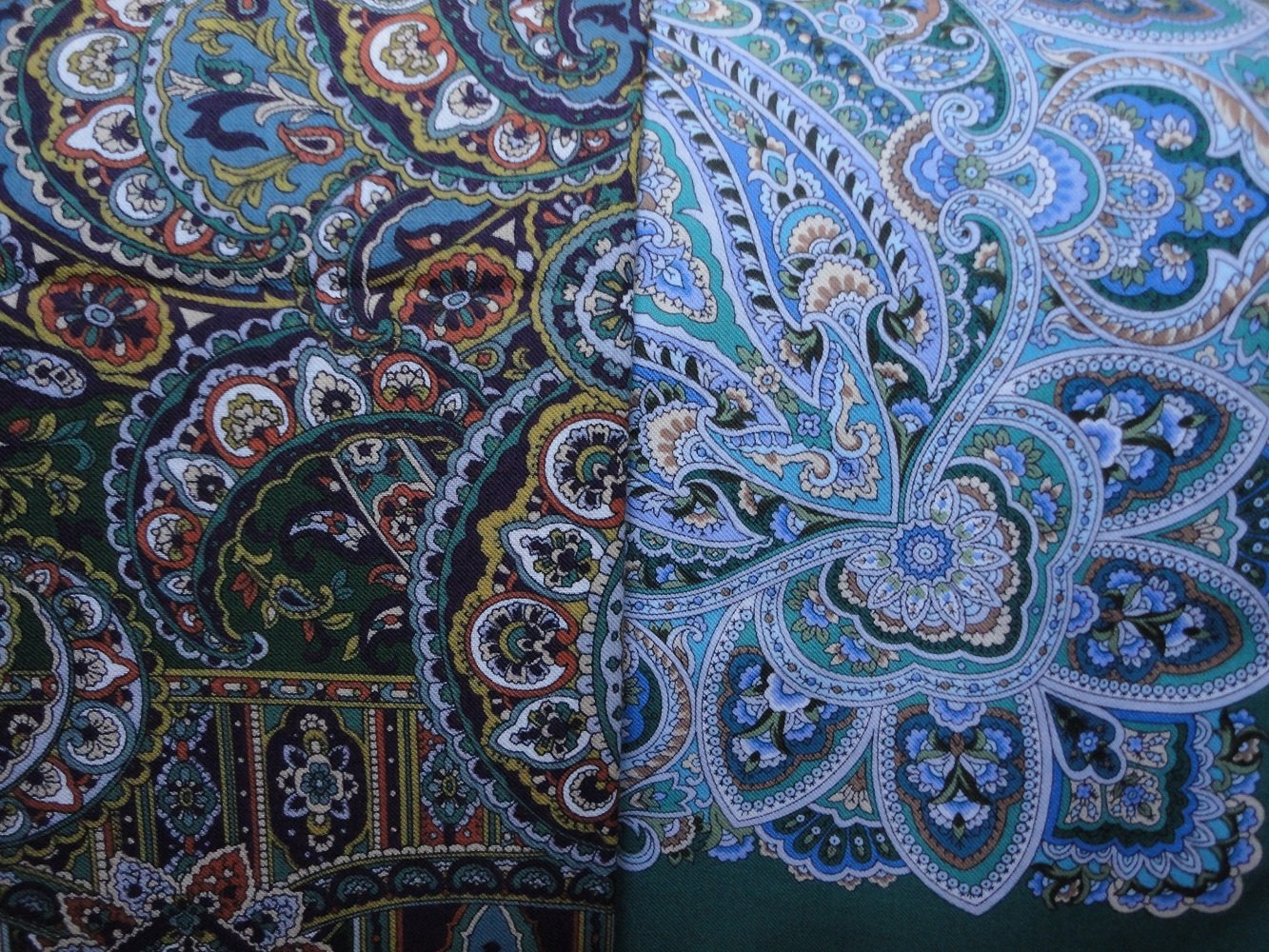 Здравствуйте ! У меня есть этот плат. По цветовой гамме он очень похож на "Бархатная ночь" -30 , а кайма - на листья на нём , только немного звонче , ярче, совсем чуть-чуть. Я бы сказала , что она всё-таки зелёная , но сине-зёлёная. На мой взгляд , цвет морской волны синЕе , но морские волны разные бывают.