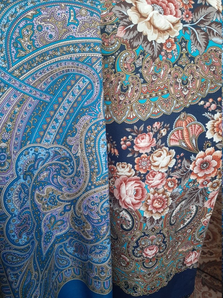 Добавлю сравнений "Мчится тройка" в 14 колорите с другими шалями, оказавшимися под рукой. Фото с телефона у окна в комнате. В жизни краски чище, на фото получилось чуть больше припыленности (или я так вижу).