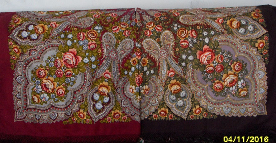 Анютины глазки, здравствуйте. Платок у вас интересный. Очень. По такой фотографии трудно что-либо вразумительное сказать. Да и тему вы выбрали не совсем ту. Здесь мы современный ассортимент, выпускаемый ППМ, "коллекционируем"