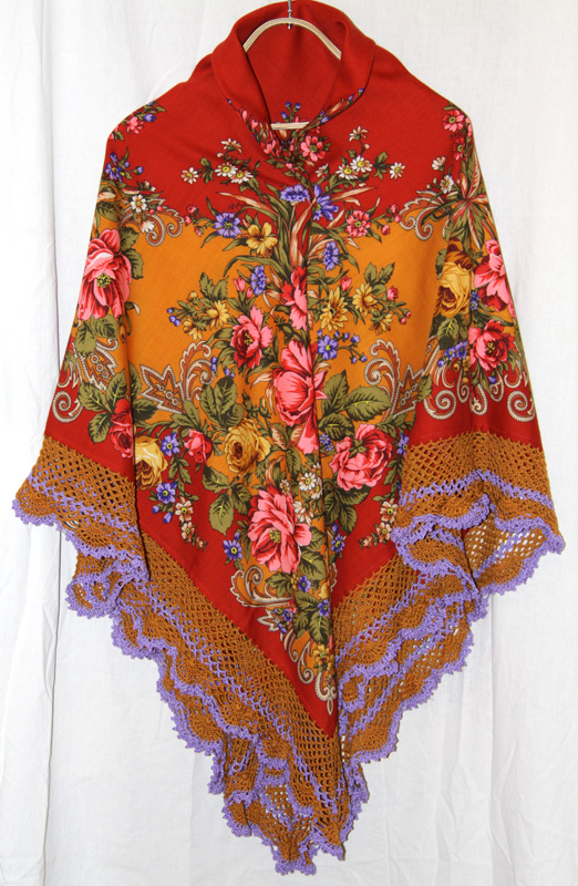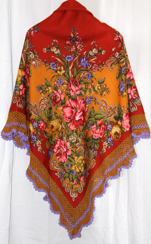 Платок Рыжее лето 1244-3, куплен был в лоскуте. Нитки Ирис, и пошло их довольно много. Глаз на этот платок я давно положила, но купить такую яркость в виде готовой шали решимости у меня не было, а в лоскуте рискнуть можно. Кайму красную пришлось почти всю срезать, что для меня было только хорошо, яркость его поубавилась. И захотелось подчеркнуть самое милое моему сердцу в этом платке - мелкие цветочки-василечки. Распускалось неоднократно, никак не выкладывалось по цвету, и узор сложно оказалось подобрать, но вязалось с огромным удовольствием.