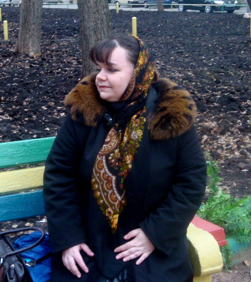 Янетта, спасибо ^% . Да, вы правы, платок завязан традиционно, один конец обвязан вокруг шеи и закреплен, а второй выпущен наружу. И немного сдвинут платок назад, потому как сейчас тепло, а зимой придется поосновательней повязывать. :)