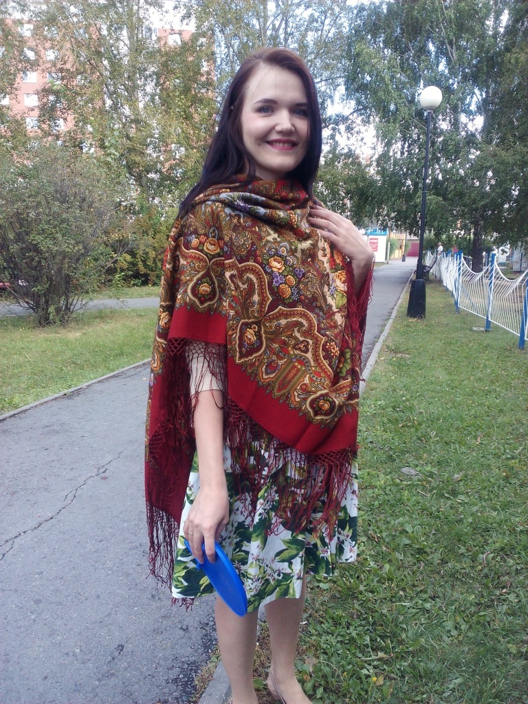 Палантин с гибискусами у Маши. Вполне себе городской палантин. С джинсовкой смотрится отлично.