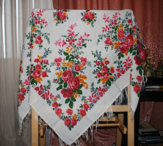 Практически наверняка павловопосадские - шаль, белый шерстяной и хлопчатобумажный платки. У шали чудесный рисунок - люблю такие живые цветы. Отдельное спасибо - за крупную ее фотографию ^% ^% ^% : вся красота видна.