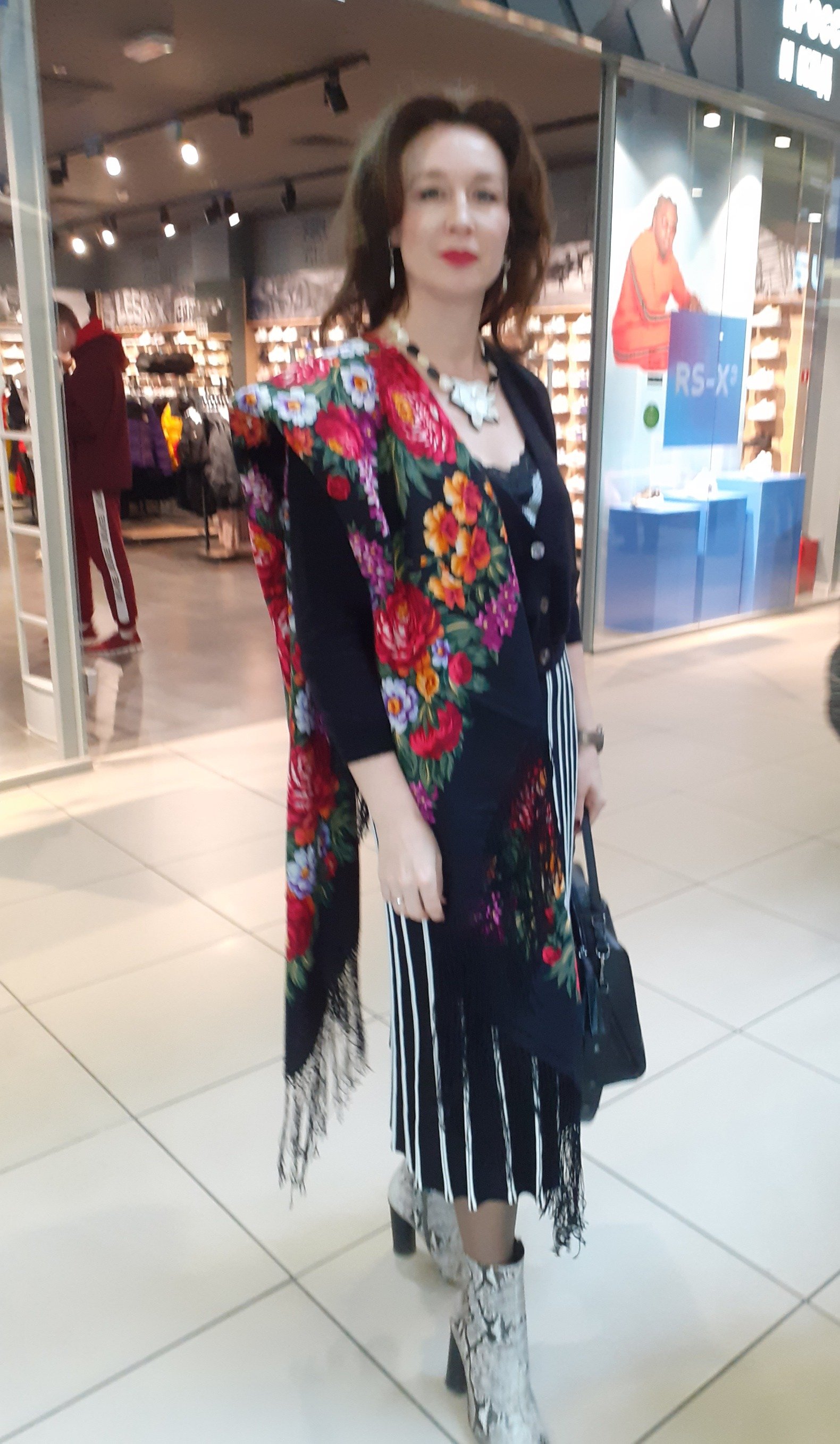 ....Очень интересный платок на моей родственнице. Это не ППМ, но тоже Россия. Я толком не успела расспросить. Запомнила только, что ткани натуральные и рисуют художники, не компьютер...