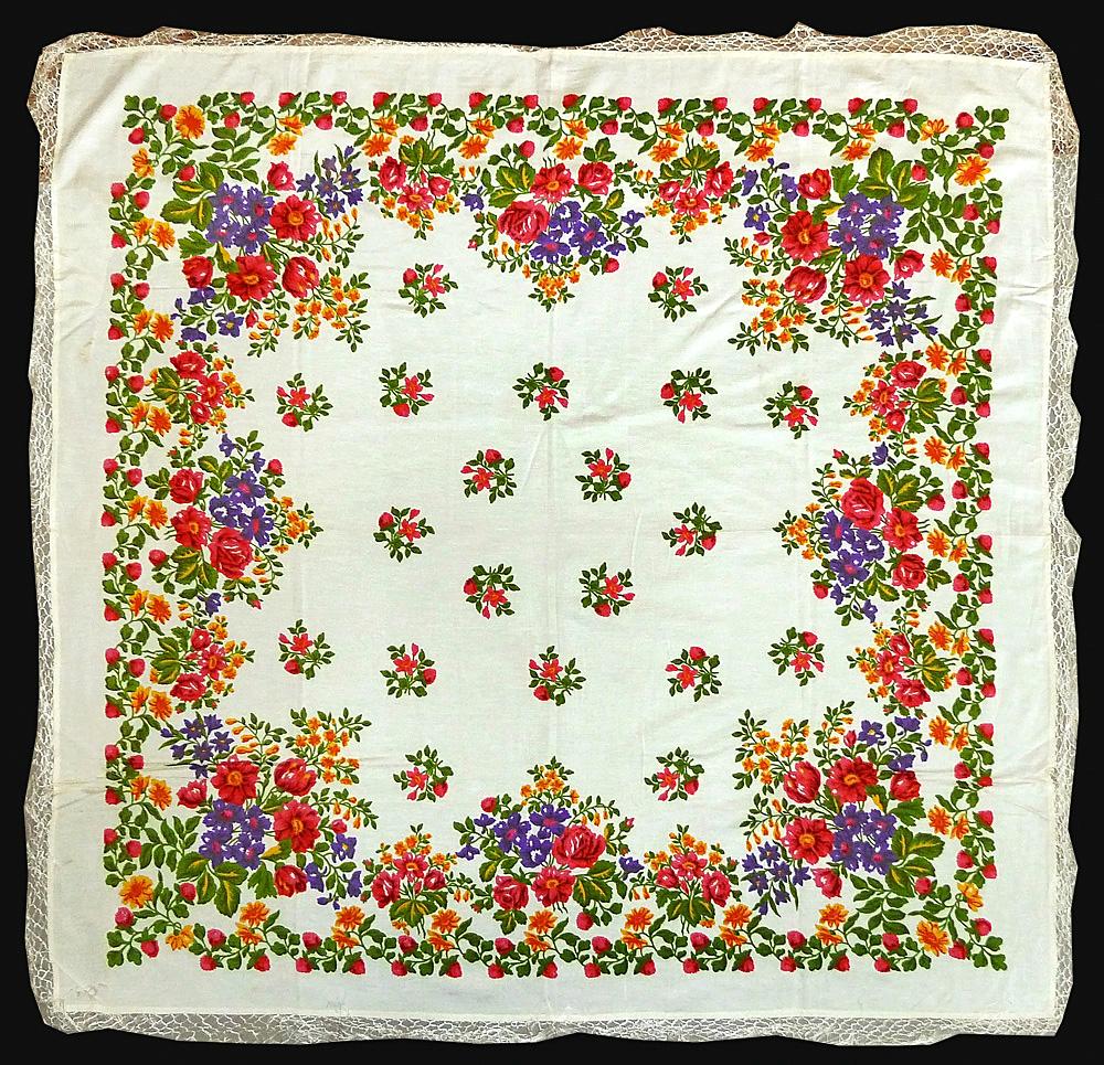 Всем привет, давно не виделись )) Вот такая интересная находка у меня сегодня. Самое интересное в ней, пожалуй - этикетка, на которой сказано, что это полушелковый платок! Набойка похожа на ручную.