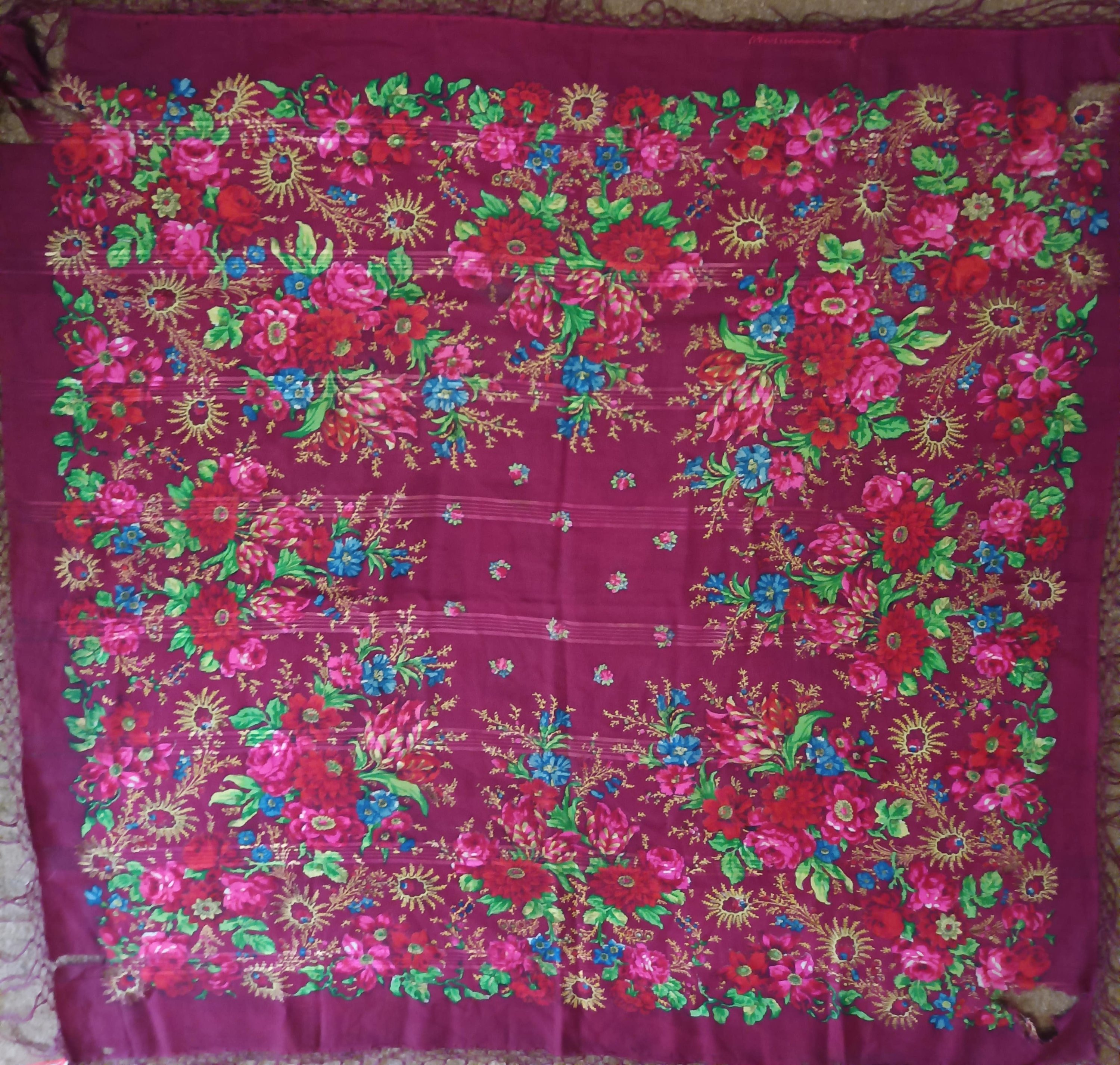 Шаль старинная 150х150 с цветочной каймой с тремя распустившимися угловыми георгинами и с мелкими розочками по среднику