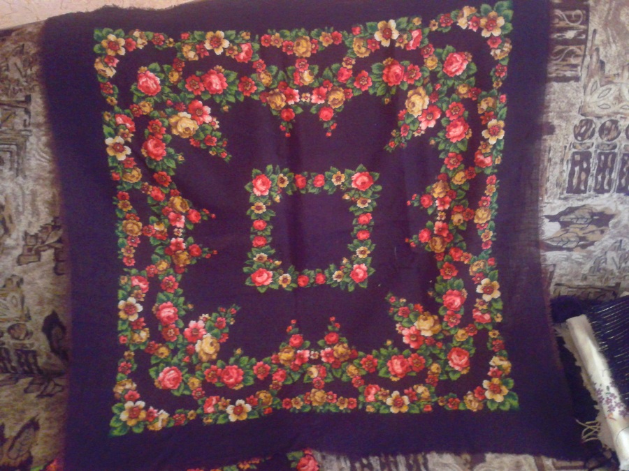 Девочки, помогите пожалуйста опознать платок. Судя по всему, это шаль, т.к. на ней 3-х рядная шерстяная бахрома. Но уж очень тонкое полотно. Шаль подарена моей дочери, её свекровью. Она принадлежала её матери, т.е. бабушке моего зятя. В общем давно куплена.