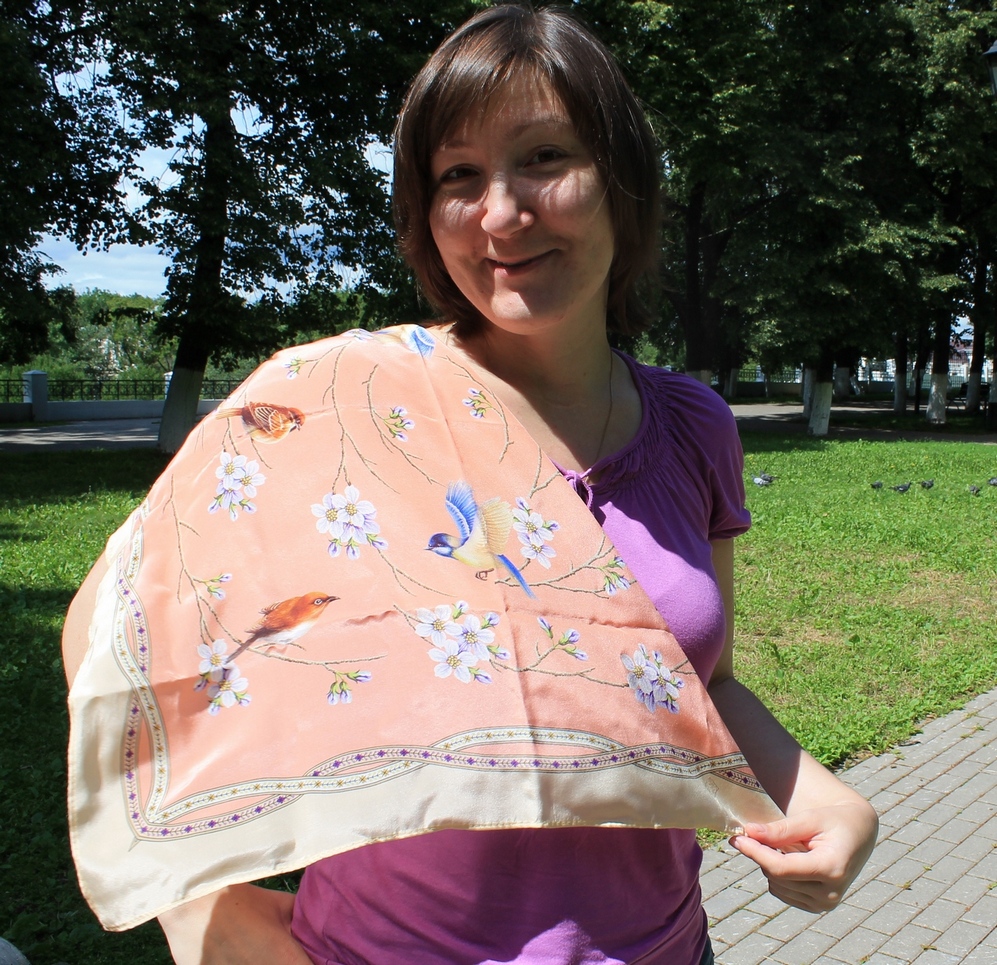 Примерили нежнейших птичек. Солнце засветило платочки. Желтый показался еще бледнее, а вот коралловый стал совершенно зефирно-съедобного цвета.