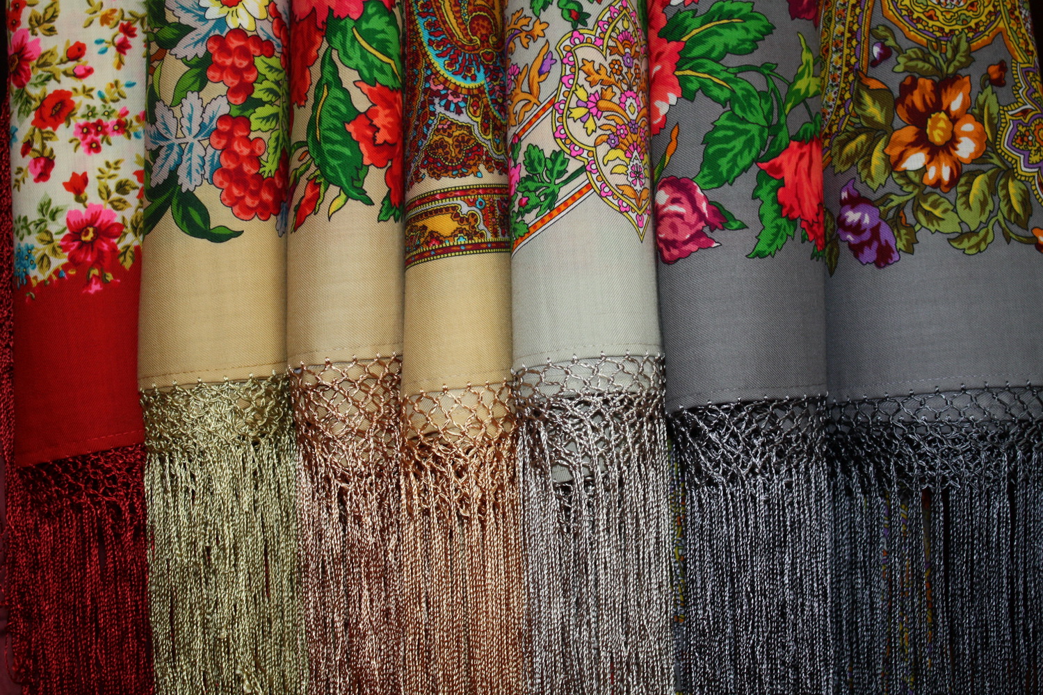 А здесь видно, что бахрома на шалях разная, и оттенки грунта тоже различны.