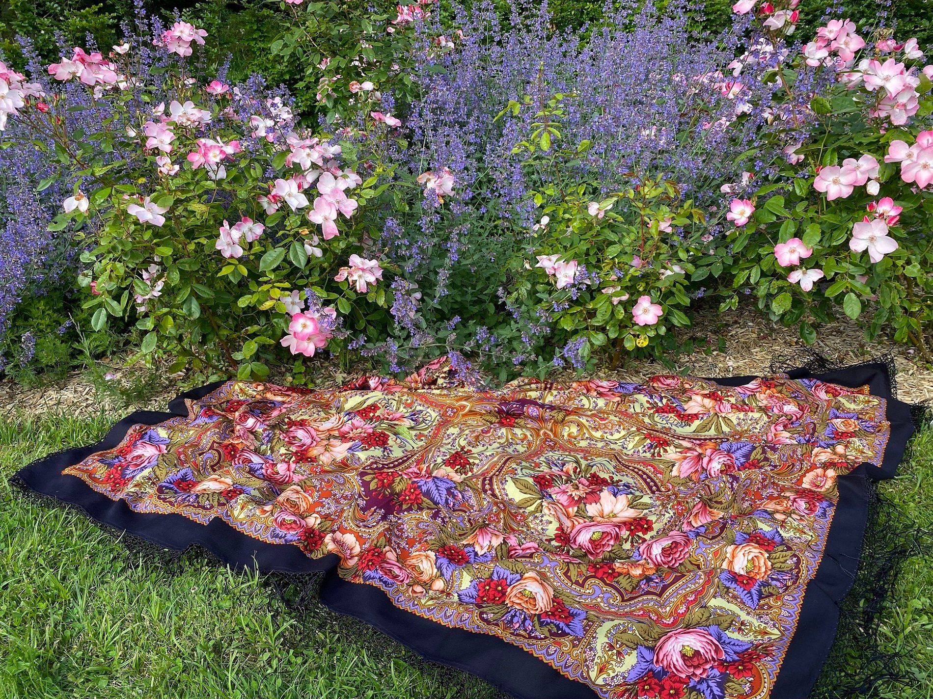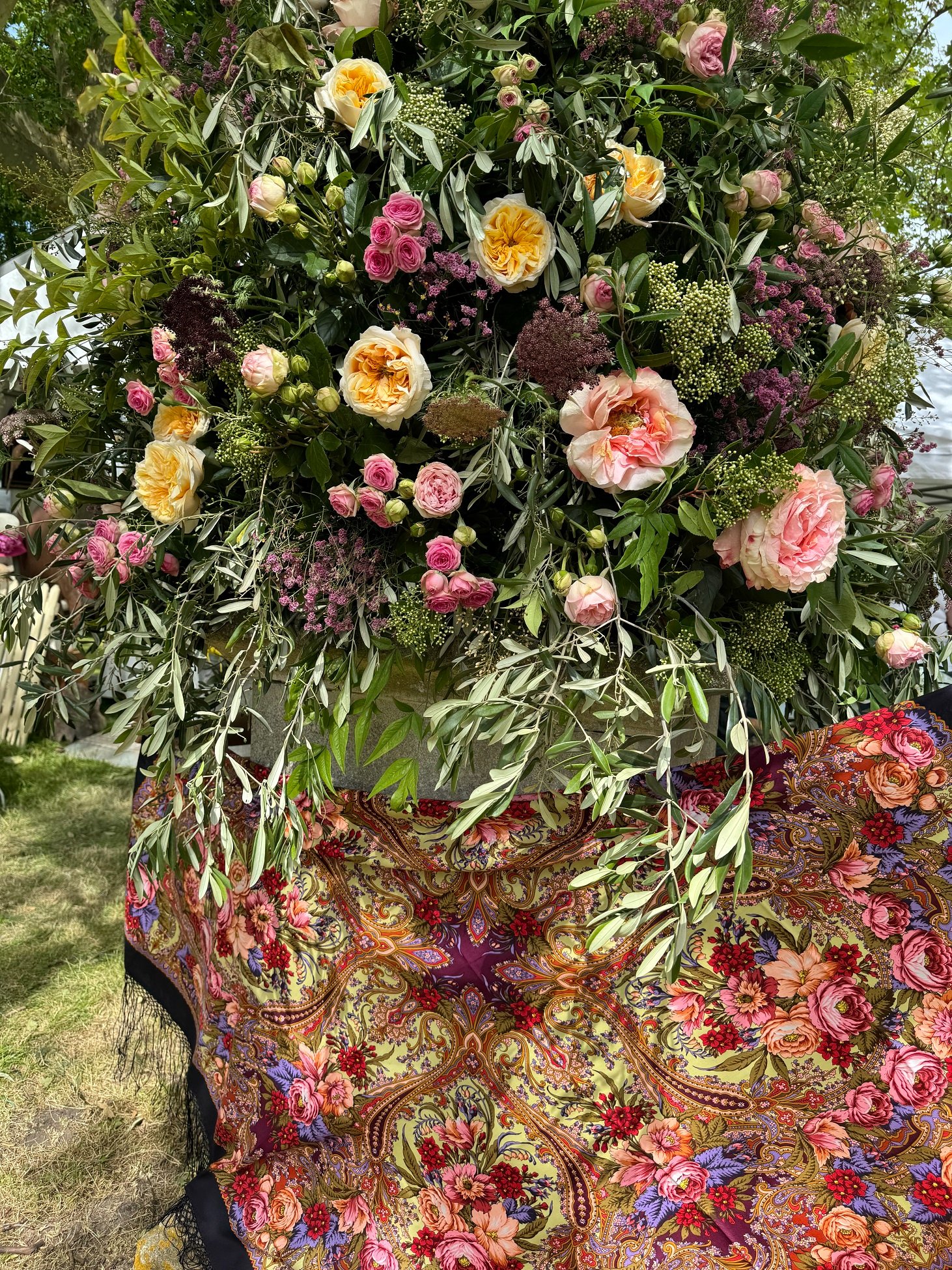 Помимо цветов, было немало стендов с самым разным сопутствующим товаром. Очень оживленно было в шляпных павильонах, многие посетители обоего пола были в шляпах, в основном соломенных, многие дамы - в платьях цветочных расцветок. И платкам Валерии Фадеевой среди моря роз, древних развалин и архитектурно-скульптурно-живописного антуража было самое место.