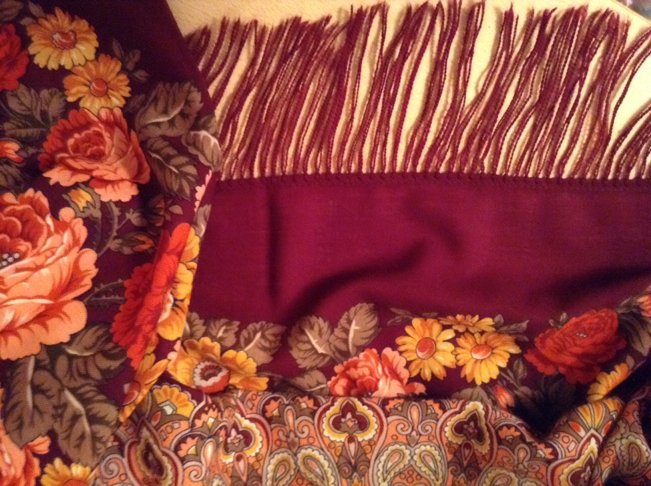 Простите, ценители Подмосковных вечеров 17, но Молитва-7 лучше (мое субъективное мнение). Среди бордовых в размере 146х146 ей конкурентов, мне кажется, нет (с НСВ не сравниваю, там и оттенок другой, и узоры). Это моя любимая домашняя шаль, уютная - просто прелесть. Я в ней хожу по дому (а в Москве в квартирах последний месяц температурка - только закаливаться), уже которую неделю сплю ночью, накрываясь поверх одеяла (Кликните, чтобы почитать, что спрятано под катом)...