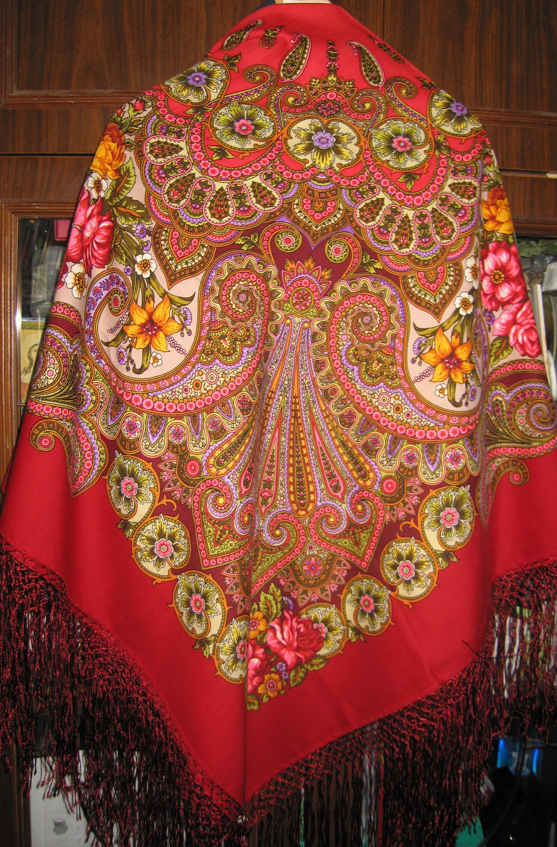 На фото шаль получилась в красных тонах, в натуре - больше вишёво-розового.
