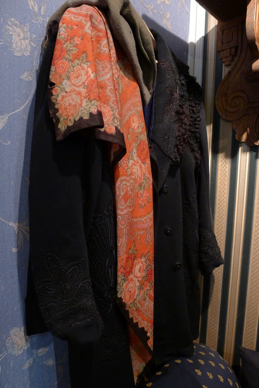 Будучи в Угличе, оказались в музее городского быта XIX- начала XX в. Музейчик маленький, в нарядном кружевном домике 1897 г. когда-то была городская публичная библиотека. Теперь в нескольких комнатах собрана всякая всячина из быта провинциальных обывателей. На одном из манекенов траченное молью черное пальто, а на плече такая же видавшая виды шерстяная шаль. Какая-либо информация о платке отсутствует. На беглый взгляд, похоже на ППМ.