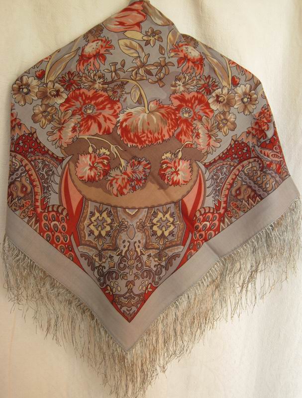Этот платок "Сады Шираза" (855-7 размер 89х89 шелковая бахрома) еще есть на сайте, в печатном каталоге его нет. У него очень мелкий сложный рисунок, который трудно разглядеть на сайте, а жаль!
