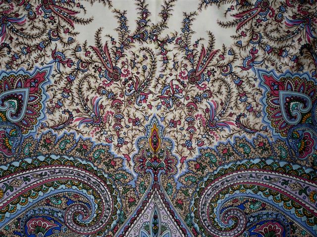 Странное впечатление от платка "Вдоль по реченьке". Название такое душевно-простое-народное, а узор и гирлянды на нем, как лепнина Екатерининского дворца (только в цвете). Ни намека на простоту. Этакое "русское барокко".