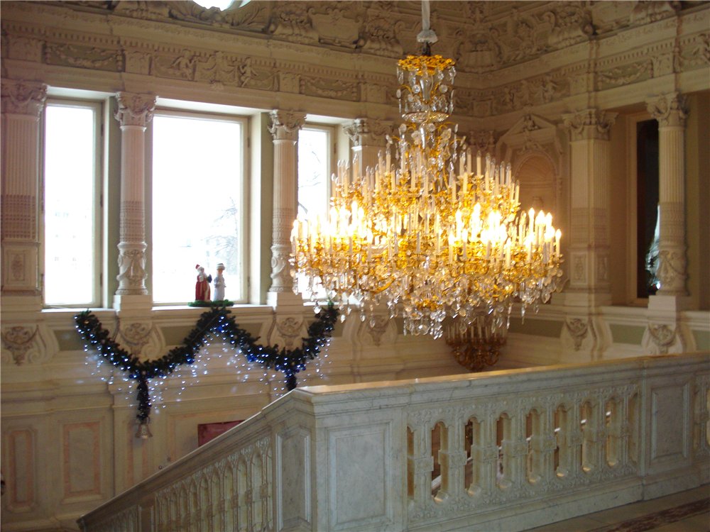 Как только открываются массивные двери дворца с фамильным гербом над ними, взору предстаёт парадный вестибюль…. и вырывается невольный вздох восхищения …парадная мраморная лестница ведущая на второй этаж, лепнина на потолках, производят впечатление крУжева, мои фотки не передают в полной мере этой воздушности, ажурности и легкости… а великолепные люстры по всему дворцу – это вообще достойно отдельной истории…