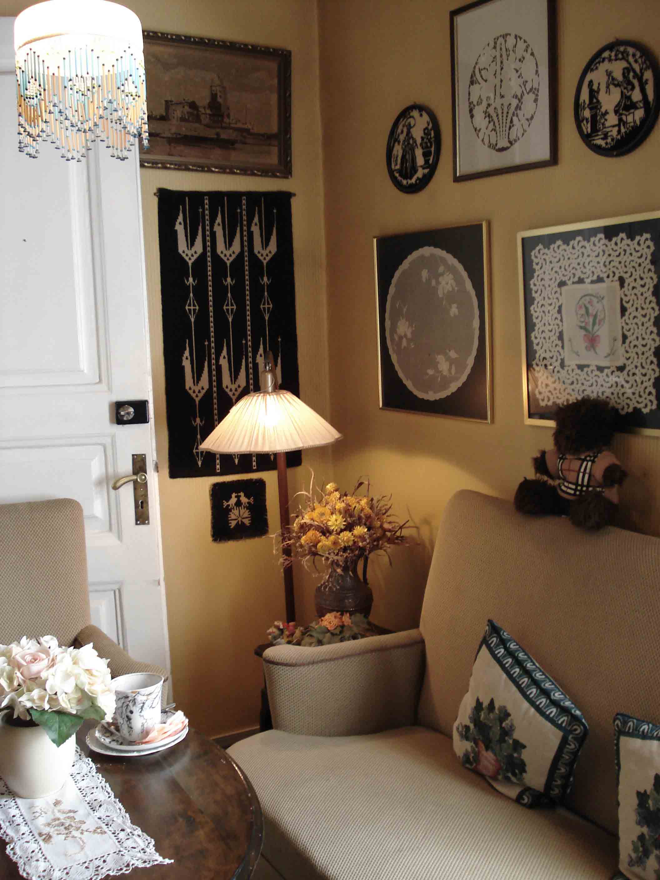 А может, пойти на веранду? Там такие ажурные столики и стулья! И все-таки нет, присядем на диван за столик с ажурной салфеткой и цветами...