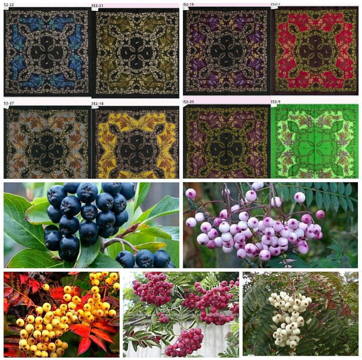 Все верно: для каждого колорита - своя рябина. Слева направо сорта - черноплодная, "вильморена", "желтая", "титан"(с желтой мякотью) и "кене".