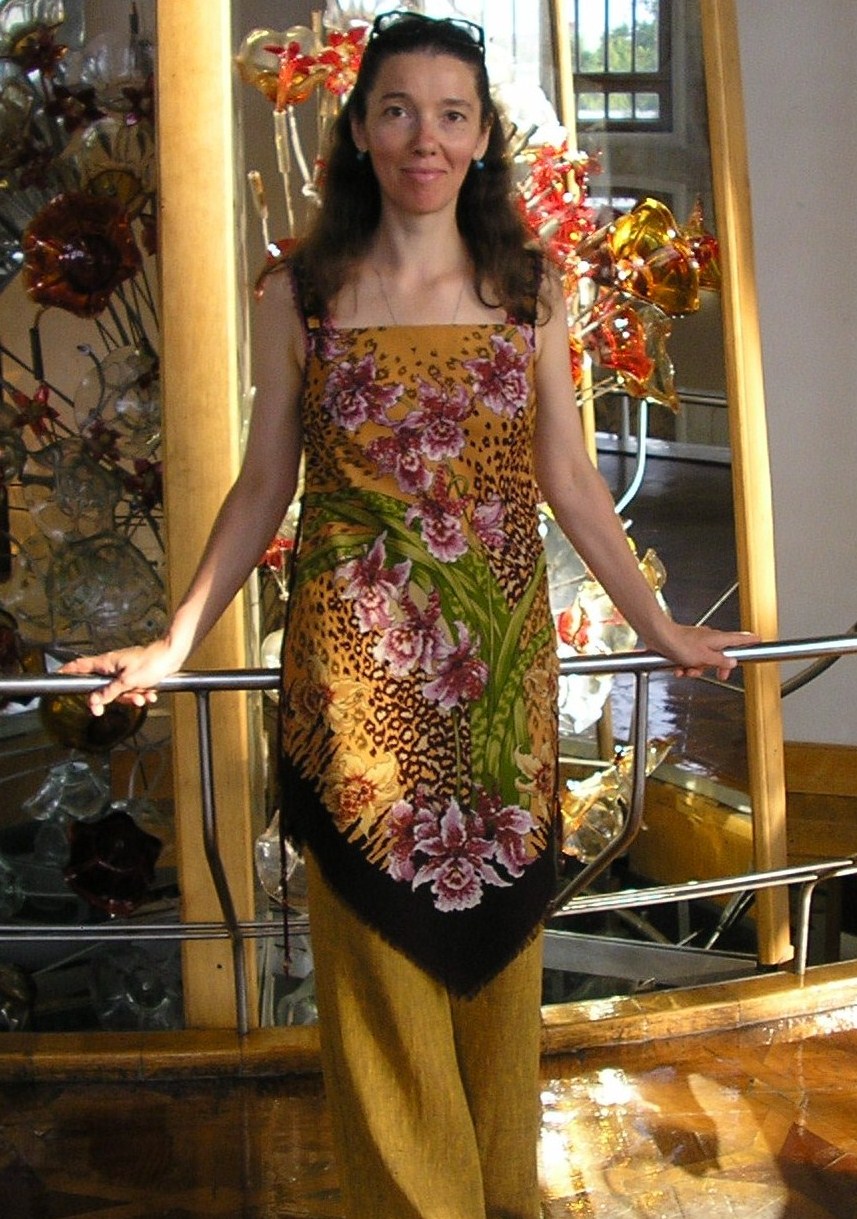 Здравствуйте уважаемая редакция второго фотоконкурса. Предлагаю вариант ношения платка как одежда. Это платье я сшила сама, к сожалению вся фотография не умещается, но полный ее вариант я отправила на электронный адрес, где , действительно получилось окружение орхидеями. С уважением, Татьяна Фурсова...