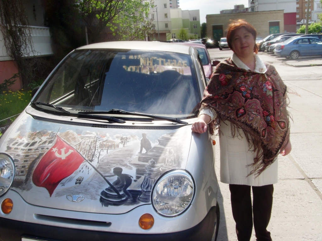 спешу поздравить всех с праздником Победы! выгуливала полюбившийся Шоколадный Миндаль-27. Попросила сына Георгиевскую ленту на капот приклеить, а он вот как скреативил
