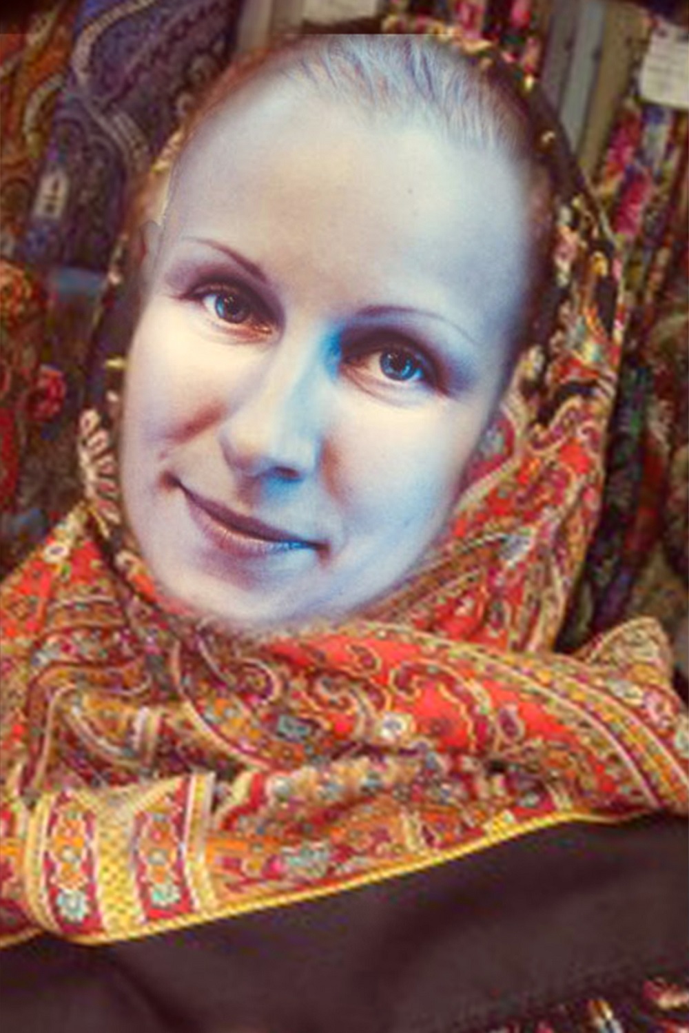 Пока мой супруг пребывал в сибирском городе Омск. Была возможность купить лоскут, по сему выбор был крайне ограничен. Решила, что платок должен быть без бахромы. Кстати, белый Сон бабочки тоже был в лоскуте. Примерила в фотошопе "бледной" подруге своей "безцветочную Бирюсинку".