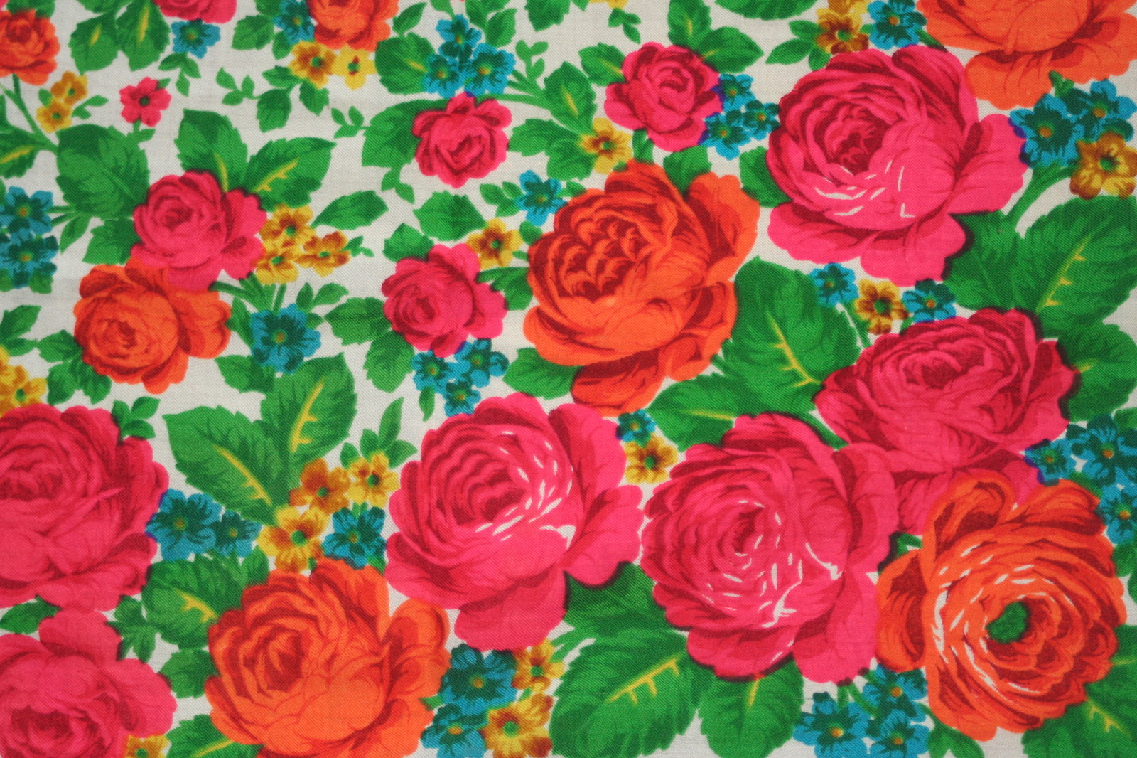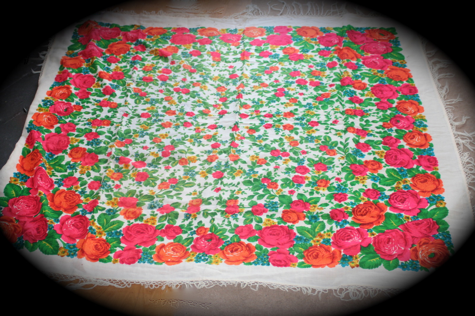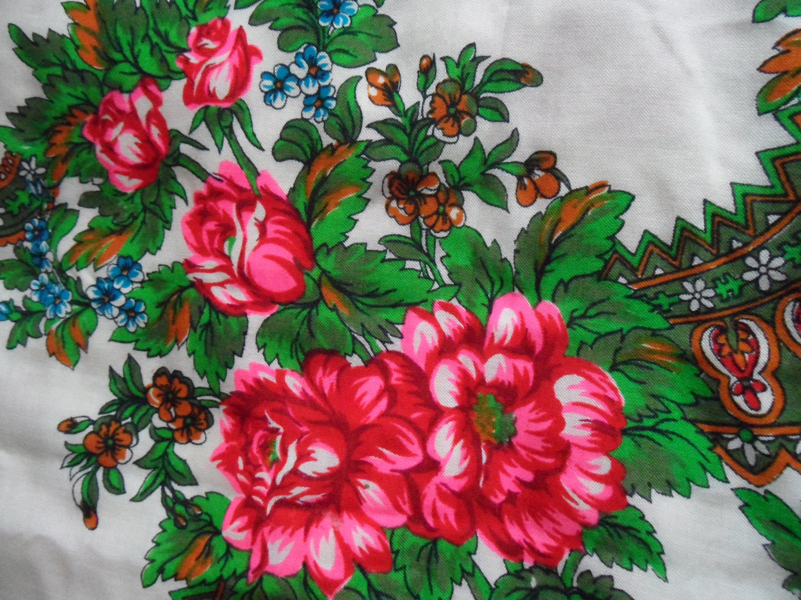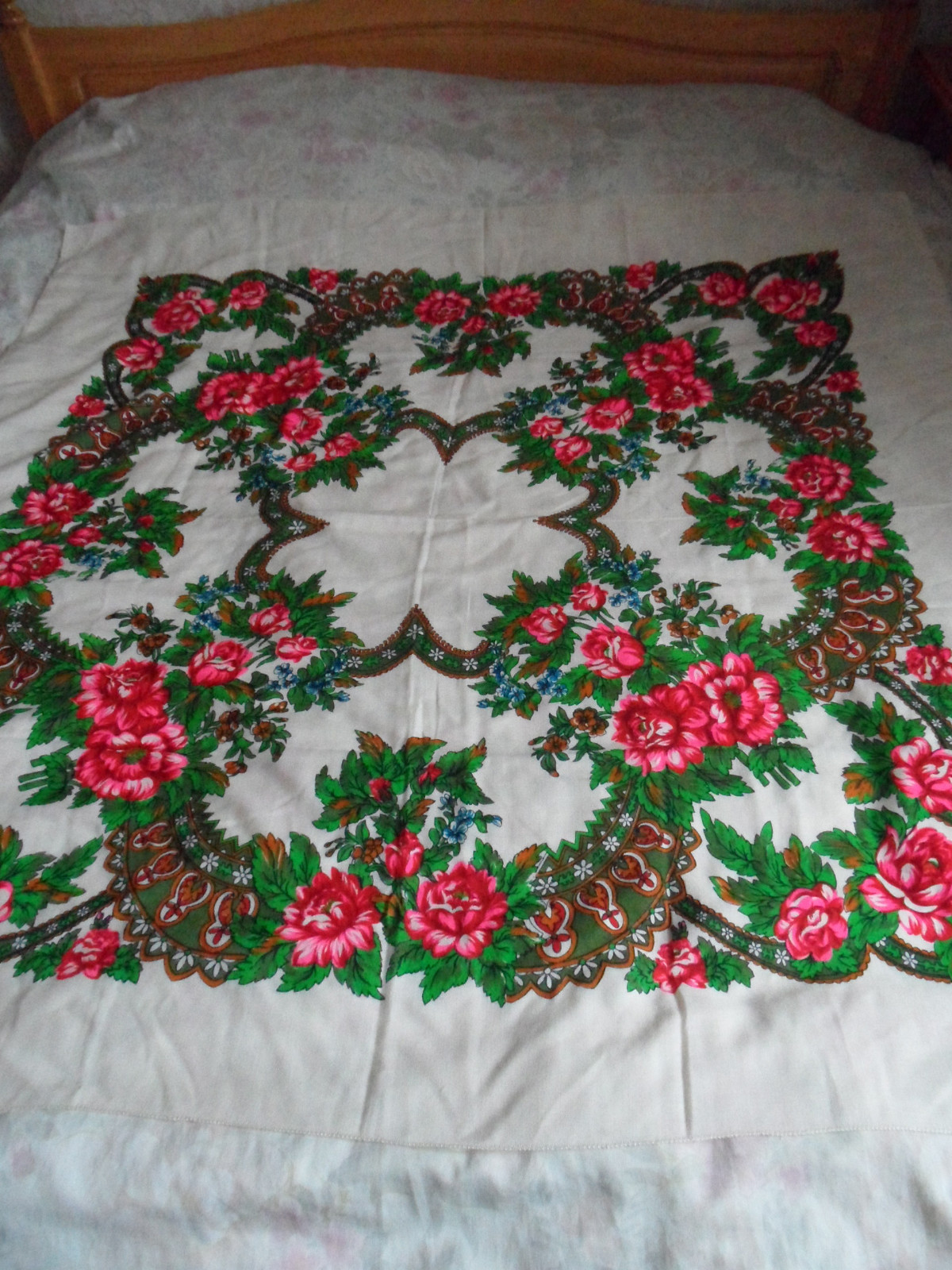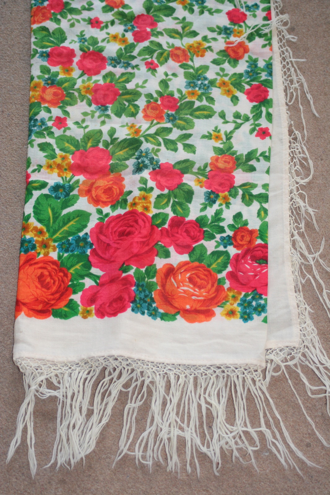 This lovely item was bought in Moscow in late 1974. It is a fine cream wool overlaid with a bright floral - the colours have not faded at all & the photos do show the accurate colourway.