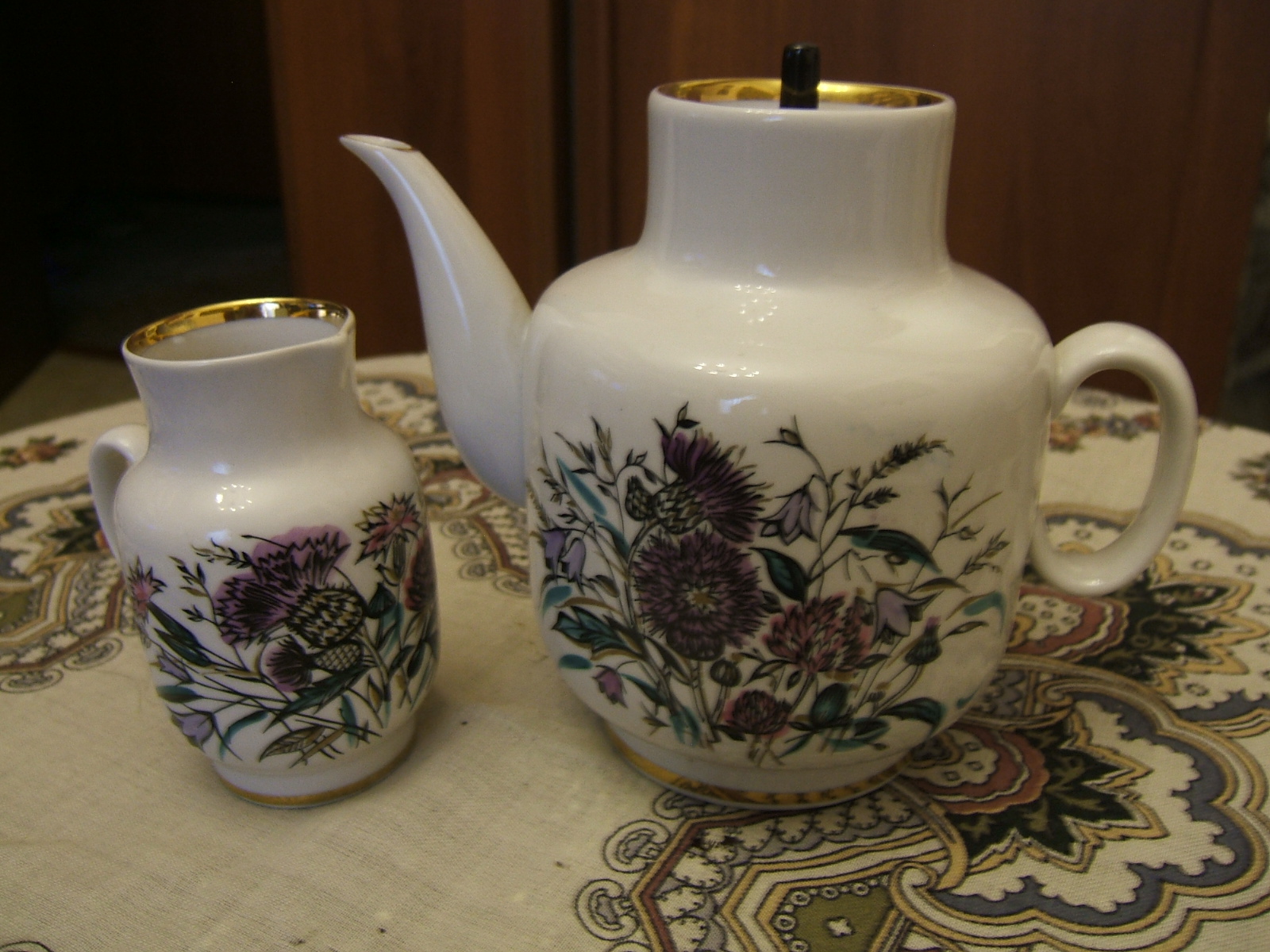 Очень понравилась тема, а поскольку мы с супругой собираем фарфор, вдвойне интересно. Поэтому позвольте маленький коллаж на фоне павловопасадского платочка. Самовар Баташова, молочник и чайная пара завода Куринова середины 19 века и сидящий в раздумье старик Гарднера.
