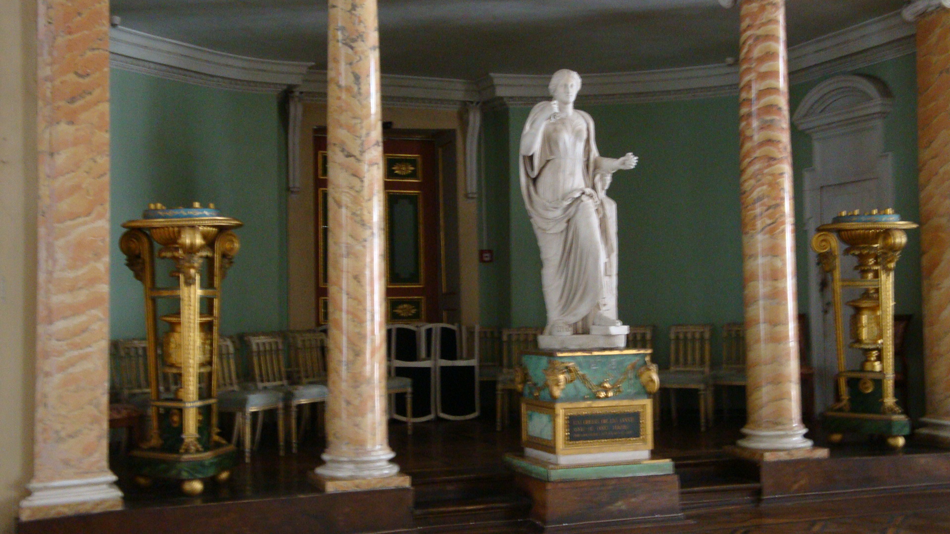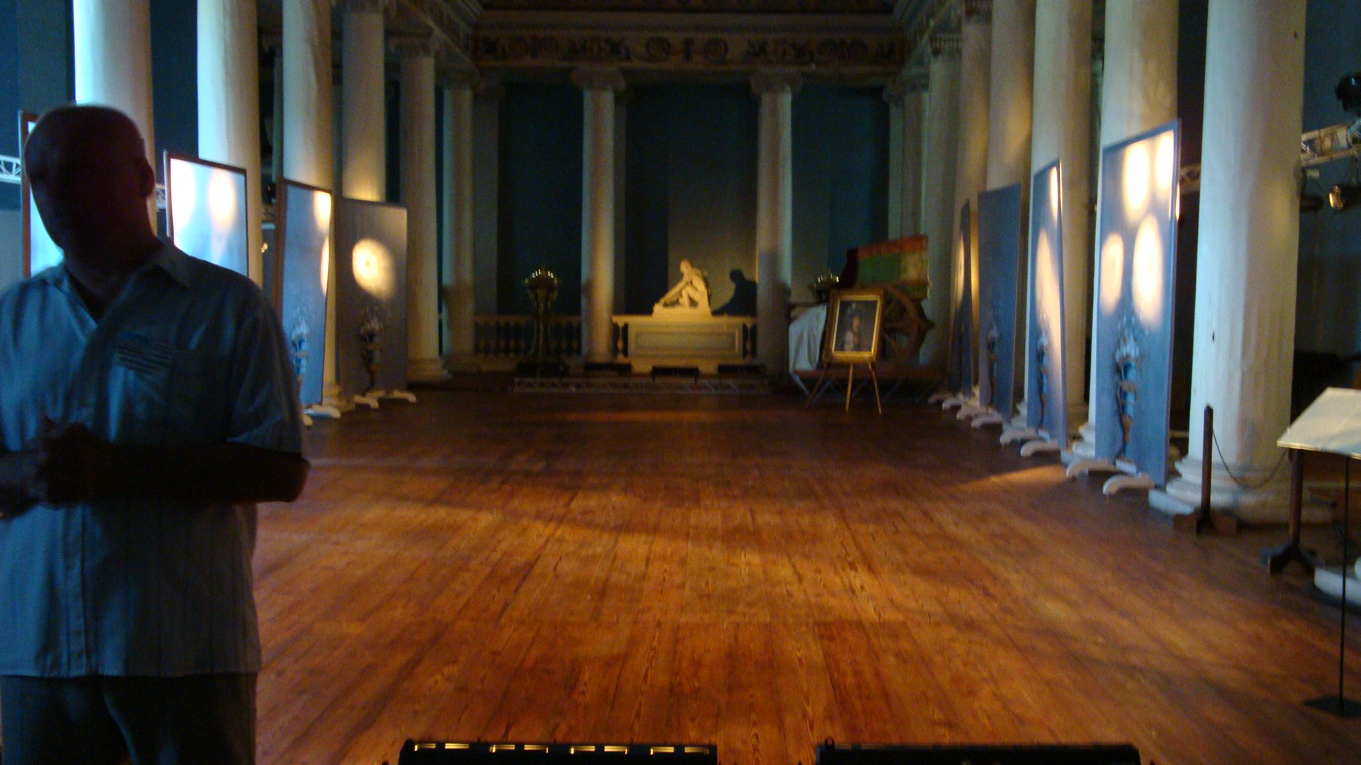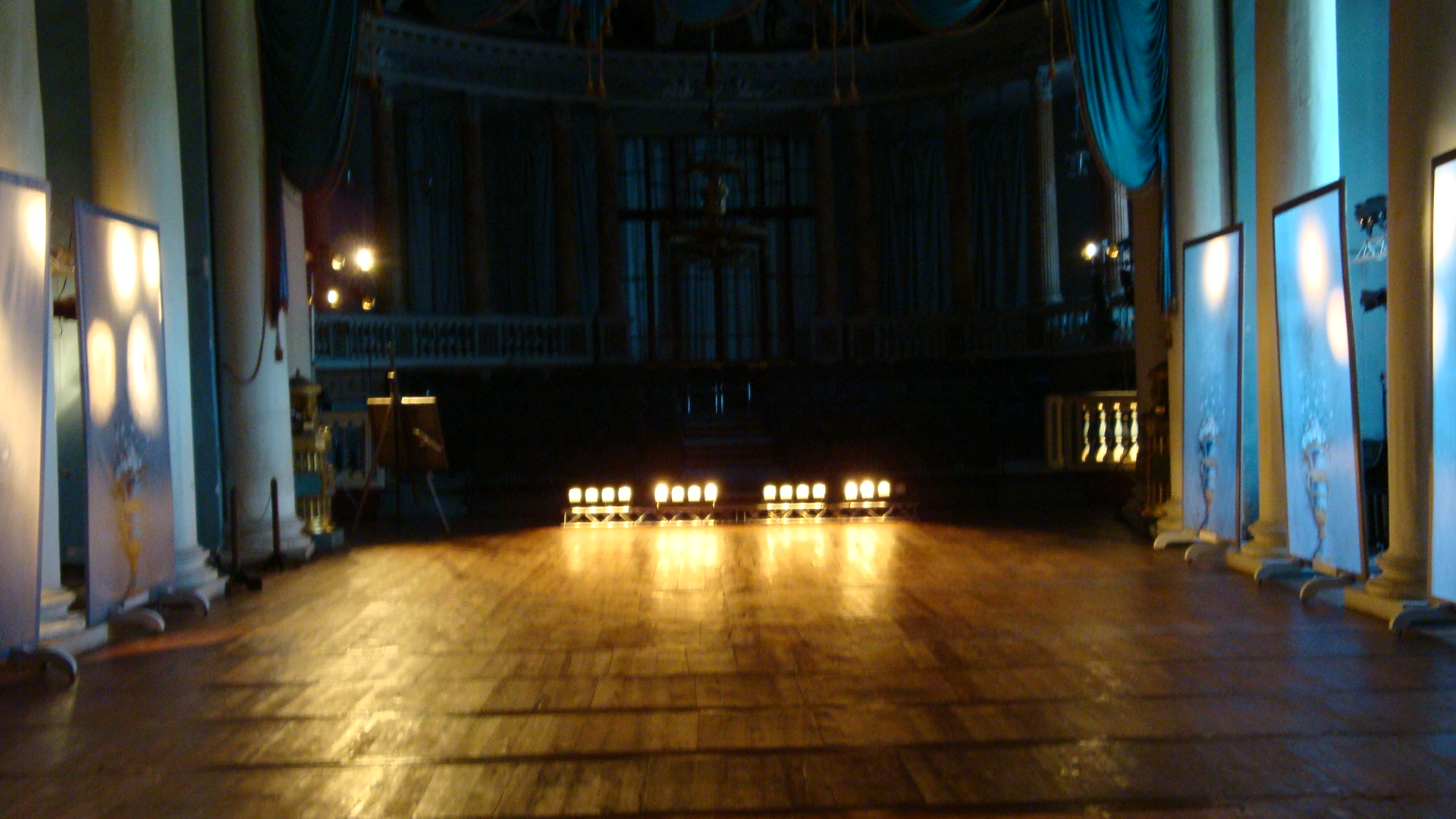 И вот наконец мы попадаем в театр! Театр представлен в бальном варианте. А раньше колонны (которые сделаны из дерева и картона) сдвигались, освобождая место для сцены. А в той части, где сейчас находится зрительный зал, разбирался пол и ставились диванчики для господ. Представьте удивление людей, которые танцевали в бальном зале с колоннами и ровными по всей площади полами, а затем, прийдя через час после прогулки, просто не могли понять, куда они попали. Потому что перед ними была уже не бальная зала, а настоящий театр с огромной сценой. Постановки крепостного театра были масштабны. Например, "Взятие Измаила", где были выстроенны огромные по размеру декорации крепости, горел за сценой настоящий огонь, шел дым, слышались выстрелы. Для смены декораций были построены специальные инженерные сооружения, которые частично сохранились до нашего времени. Нам показывали специальные желоба в стенах, по которым пускали воду, чтобы получить звуки идущего дождя, машину для получения звуков грома, было устройство с помощью которого сверху сыпали муку, изображавшую в свете свечей снег.