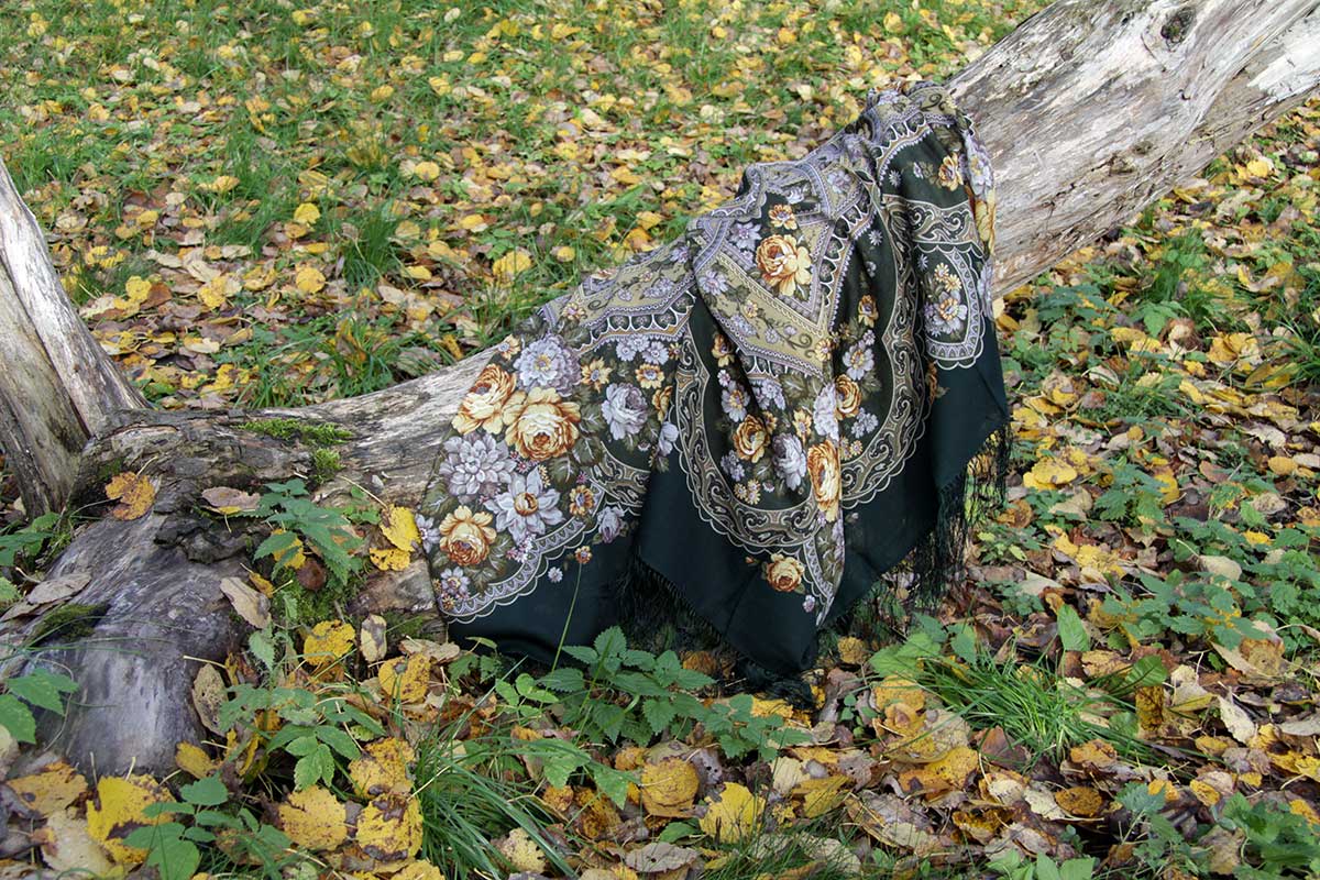 По случаю Покрова, платок Праздник Покрова 754-9. У меня мало зеленых платков, почти нет, не идет мне теплая зелень, а здесь она как раз холодная, с изумительными по оттенку белыми розами. Картинка получилась, как и платок, можно сказать, почти монохромная, полная противоположность Подмосковным вечерам.