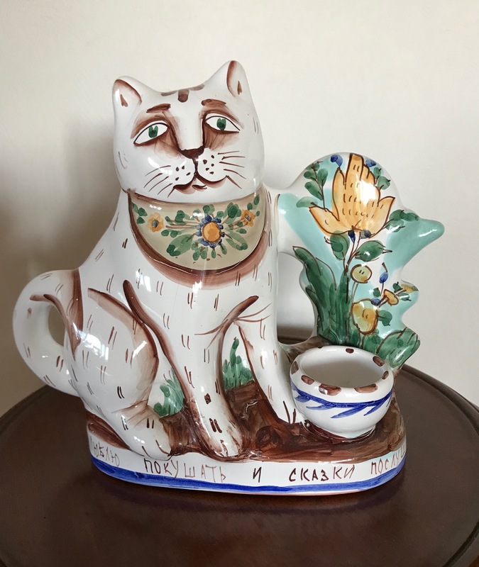 Для сравнения, покажу подсвечник периода 90-х, ( который демонстрирует моя кошка Зося) и сравнительно недавно ( 2017 г) приобретенную майолику в изделиях мелкой пластики, молодых художников Гжельского завода. Традиции росписи сохранены.
