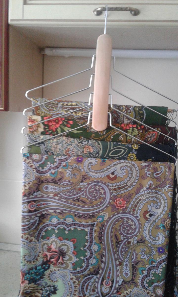 Шали по одной на вешалках, они висели в ряд на штанге от Белых роз начиная и заканчивая Цветущим садом. Платки стопками по размерам и бахроме на невысоком комоде под штангой с шалями, их меньше, сразу видно.Лада писал(а):Листва- а по названиям это как раскладывать? ....А если все вроде по цветам а "непонять чего" по кайме то все наглядно.