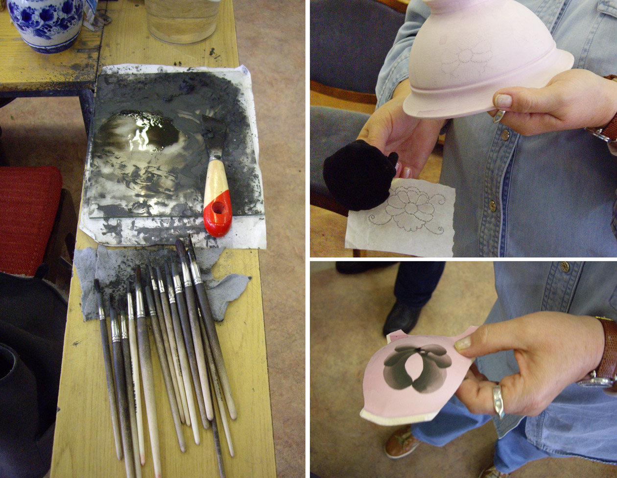 Для рисунков посложнее делается трафарет. Через дырочки в кальке на фарфор мешочком с угольной пылью наносят контур рисунка. Самые сложные композиции намечают карандашом - графитовые линии тоже исчезают при обжиге.