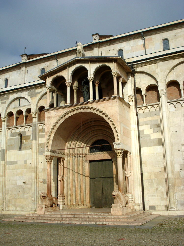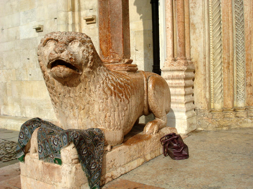 А я, когда бываю в Италии, как-то про платки забываю, даже про итальянские.Получилось какое-то совсем кулинарное путешествие и покупки соответственные. Объездила с десяток городов с Садко, а вспомнила о нем только в Модене, куда поехали настоящий бальзамический уксус купить многолетней выдержки. Фото с платком получились совсем бездарные, но хотела хоть такие показать, что же он совсем зря ездил. Это портал собора, со всем сторон украшенного львами