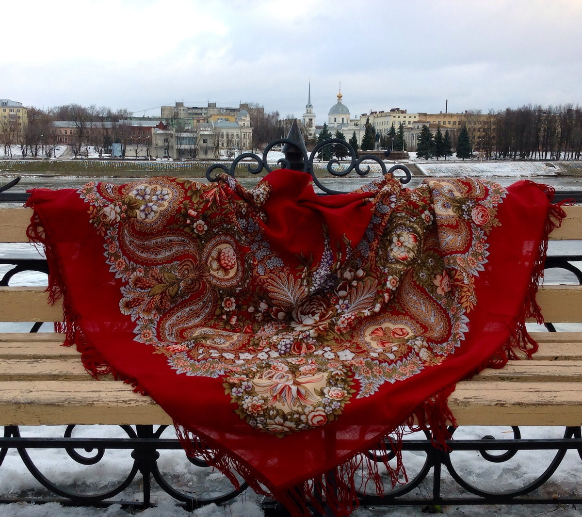 Вот мой новый красный платок (в моей любимой теплой гамме) на набережной реки Волги в Твери.
