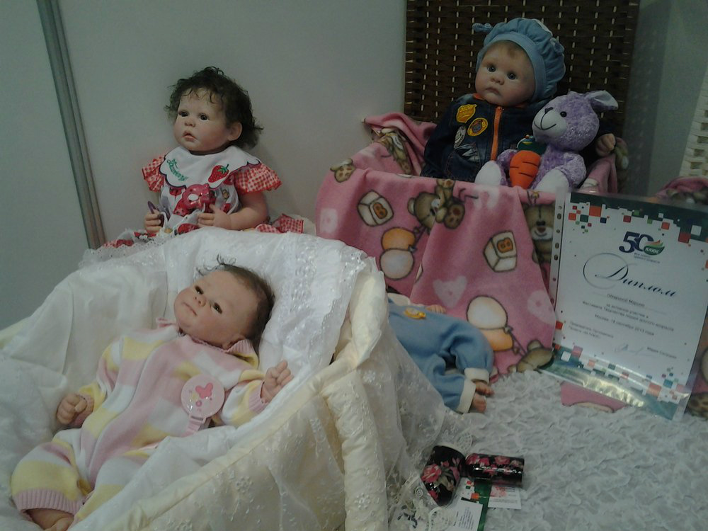 Буду добавлять понемножку фото с фестиваля. Пока еще мои "детки", делала к этой выставке, девочка в красном, зову ее Ивушка, не знаю, почему, у меня имена сами всплывают в голове, пока делаю, рыжий голубоглазый бутуз - Фунтик, а в люлечке пока без моего имени, по паспорту молд зовется Коко-Малу