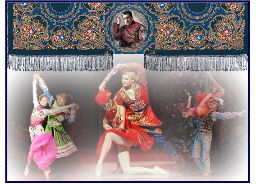 Недавно упоминали шаль Русские сезоны,у меня ее нет,но коллаж как то сразу возник перед глазами сам собой. Это -Дягилев С.,это- русский балет и т.д. и т.п.