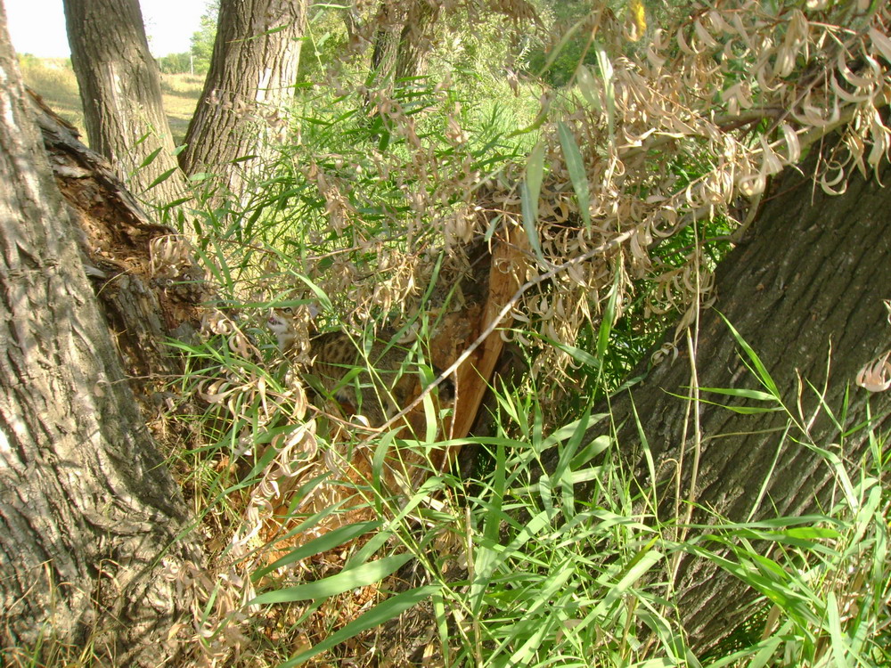 Кошку Вашу нашла(благодаря возможности увеличить фото) - прямо в разломе дерева, стоит Василиса, чему-то наверху заинтересовавшись....Забавно схватили: окрас кошки вписался в летние краски природы на 100%, прикрыл от опасности....