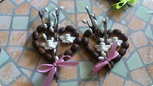 Магниты кофейные с элементами пластики и магниты цыплята (тоже детки делали)пластикой пользовались для создания яиц