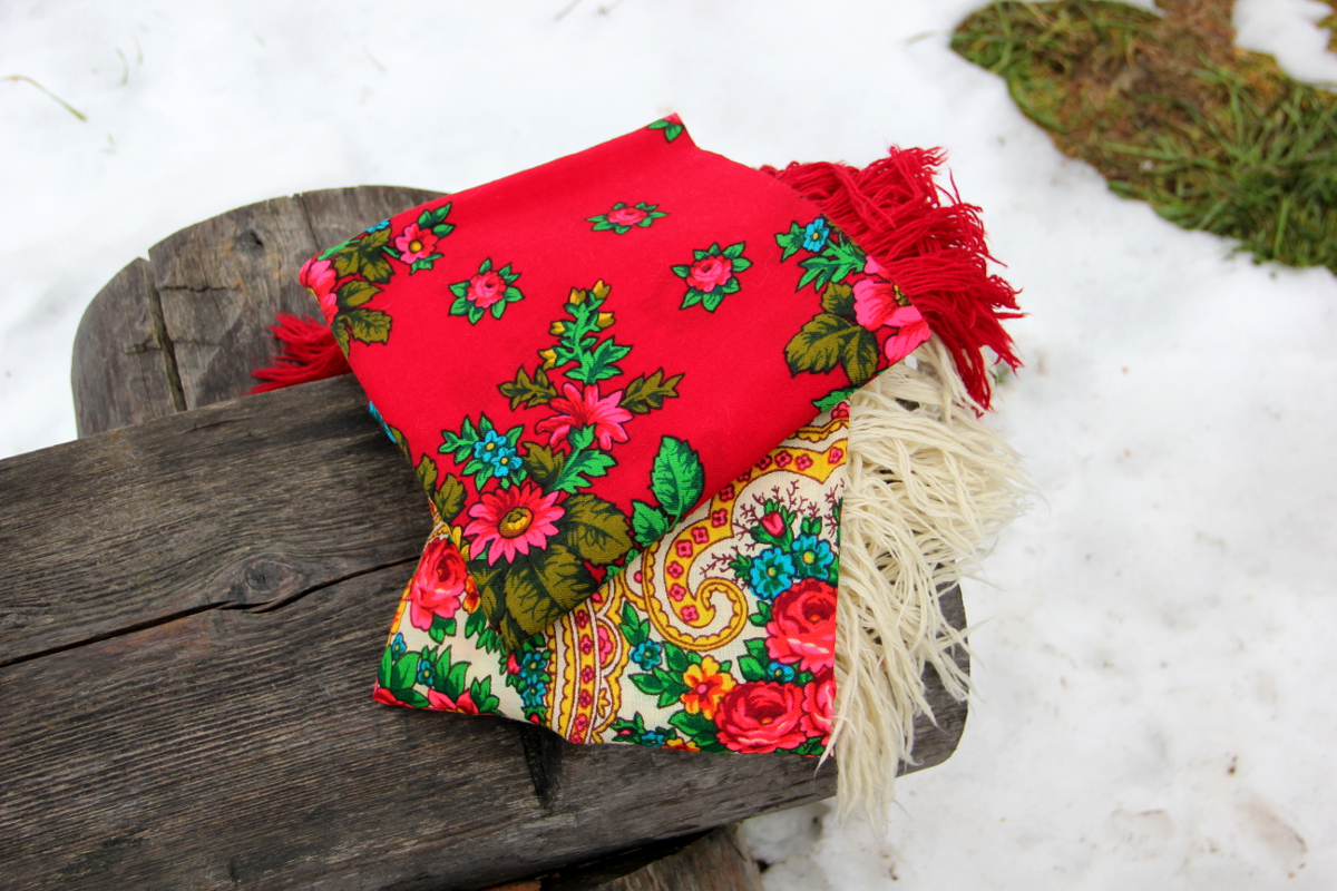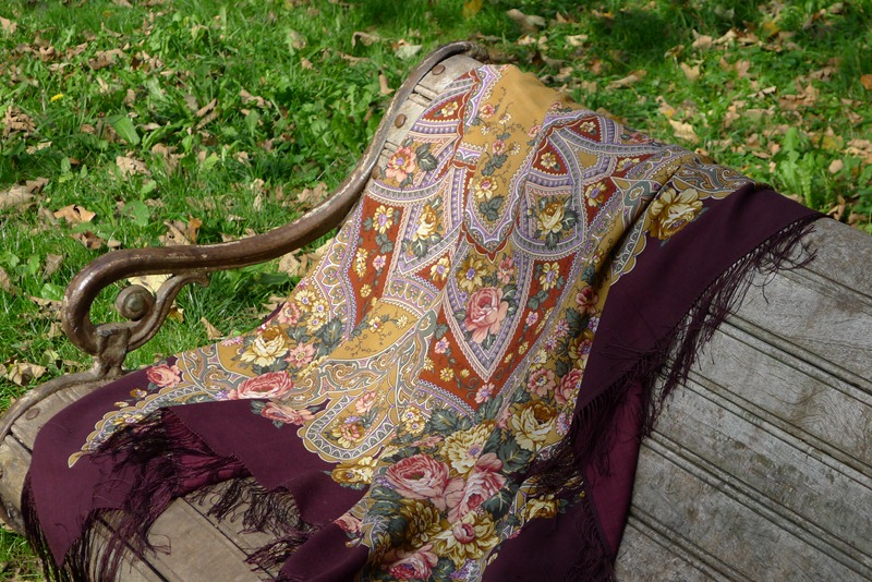 boulangerie, на фоне белого снега чётко видно, что ткань пожелтела от времени у платка и всё равно краски яркие, но без вырвиглазности. Самый выигрышный фон для платков-"старичков"-снег и дерево ( имхо)