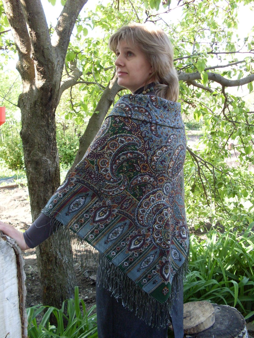 Спасибо, Varezhka! Я вот тоже с большим удовольствием отмечаю, что примерять и показывать стали намного больше. Смотреть на всех так приятно! Ласковый вечер , Ваш шарфик, как нежный букет на фоне сдержанного, нейтрального тона жакета. Наверное, вблизи еще приятней смотрелось. ЛЮБАВА,Такой сложный для меня платок "Лето в Павлове" (любовалась им очень, но не знала как поступить со столь крупным рисунком) Вы замечательно подали!Ваши дочери должно быть ужасно гордятся своей мамой - вы очень яркая и эффектная . Вообще,как только я начала носить шали, заметила, что первые, кто реагирует на них - дети и очень эмоционально:удивление, восторг на личиках. Вчера пошла на почту, рядом с ней ко мне две девочки лет четырех подошли и спрашивают: "А Вы куда идете?" Показываю - недалеко. "А можно и мы с Вами?" Взрослые взглядом дали добро. Пошли рядом как два розовых гриба(обе под зонтами) и стали рассказывать о своей жизни. Одна, поменьше, хрупкая такая, очень грустную историю - об умершей маме...Проводили меня, попросили завтра снова прийти. Долго махала им. Когда рассказала мужу эту историю, он спросил "А в каком платке-то была?". "В Волшебнице". "Ну ,тогда все понятно..." Думаю, и правда, детскую душу завораживает сказочный вид женщины в платке...Моя небольшая выставка сегодня - это ода всего лишь одному платку (наверно навеяно примерами рядом). Я еще не очень освоилась в разнообразных стилях и способах ношения, хотя очень хочу, и с вашей помощью обязательно освоюсь...Просто я хотела показать платок тем, кто раздумывает, кто не знает и просто тем кто любит его. Показала его и издалека и вблизи - покупая, мы не всегда представляем как это будет выглядеть. Смотрите - судите...