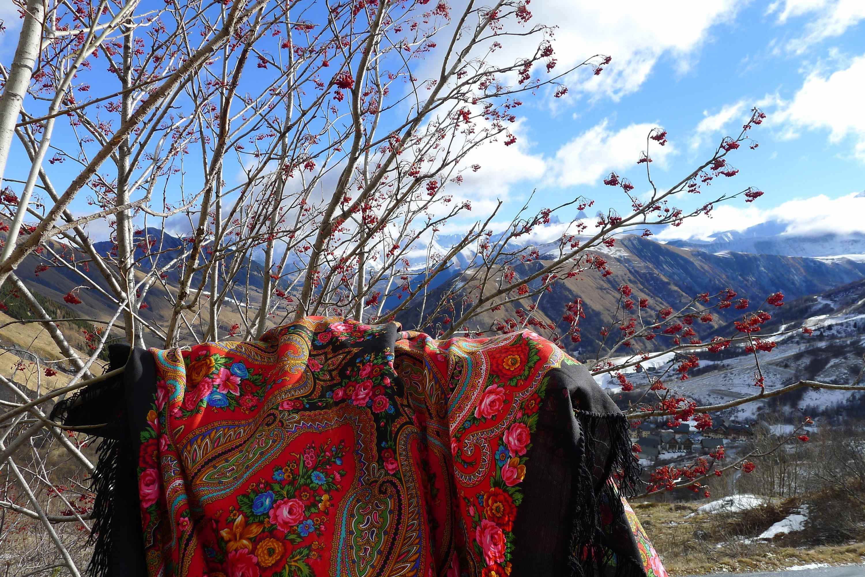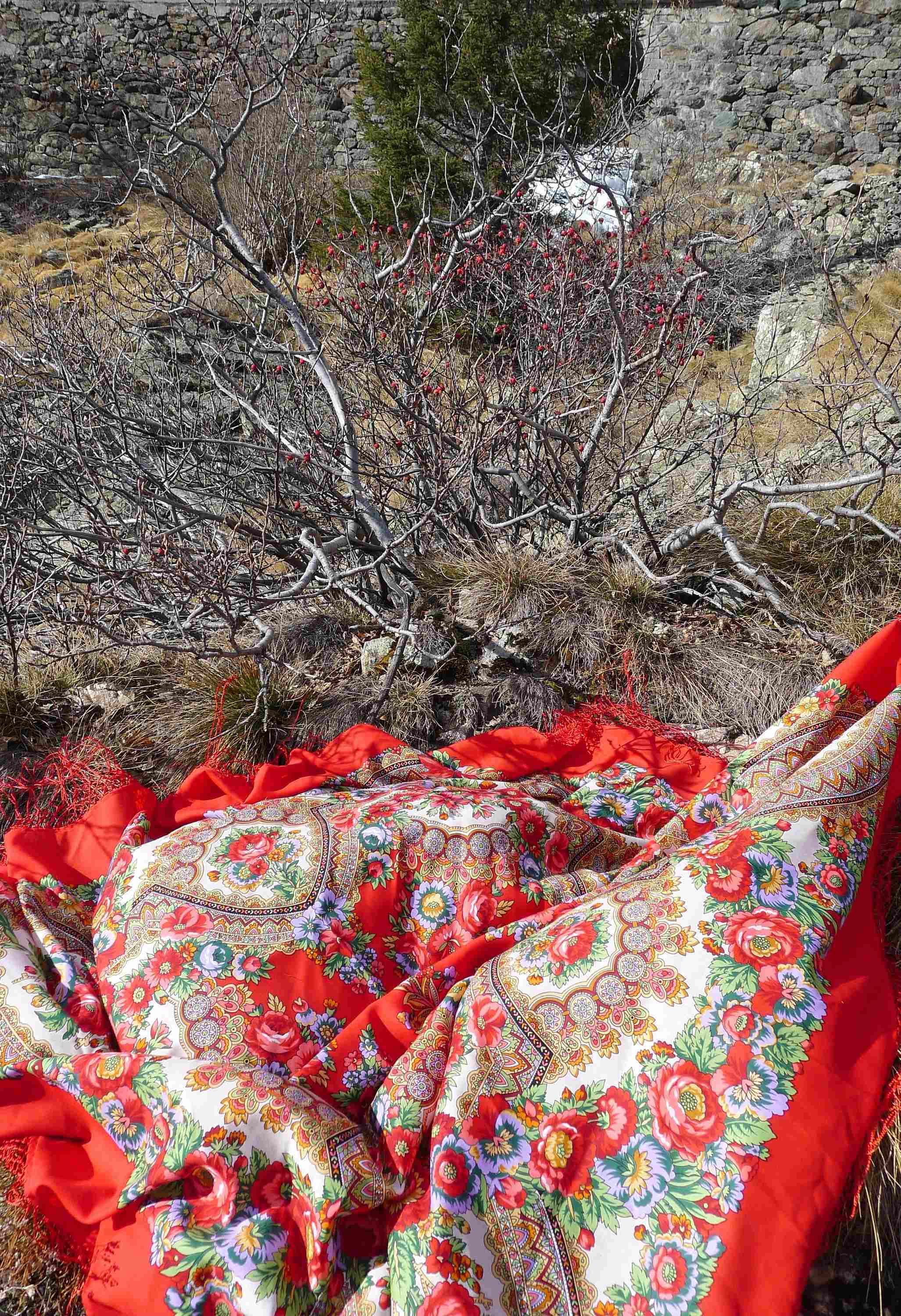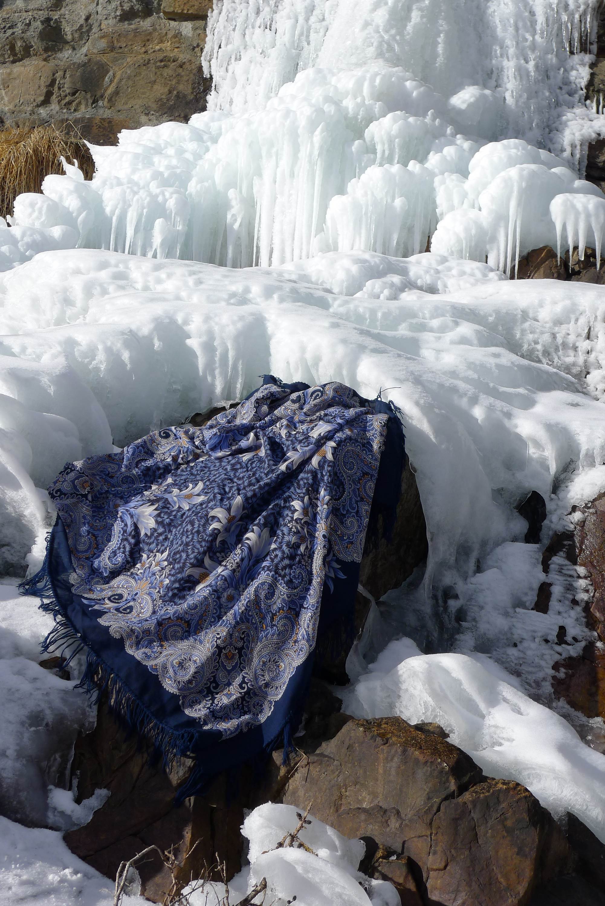 Замерзшие речки, камни и скалы, алые ягоды, синее небо и яркие платки- восхитительное зрелище.