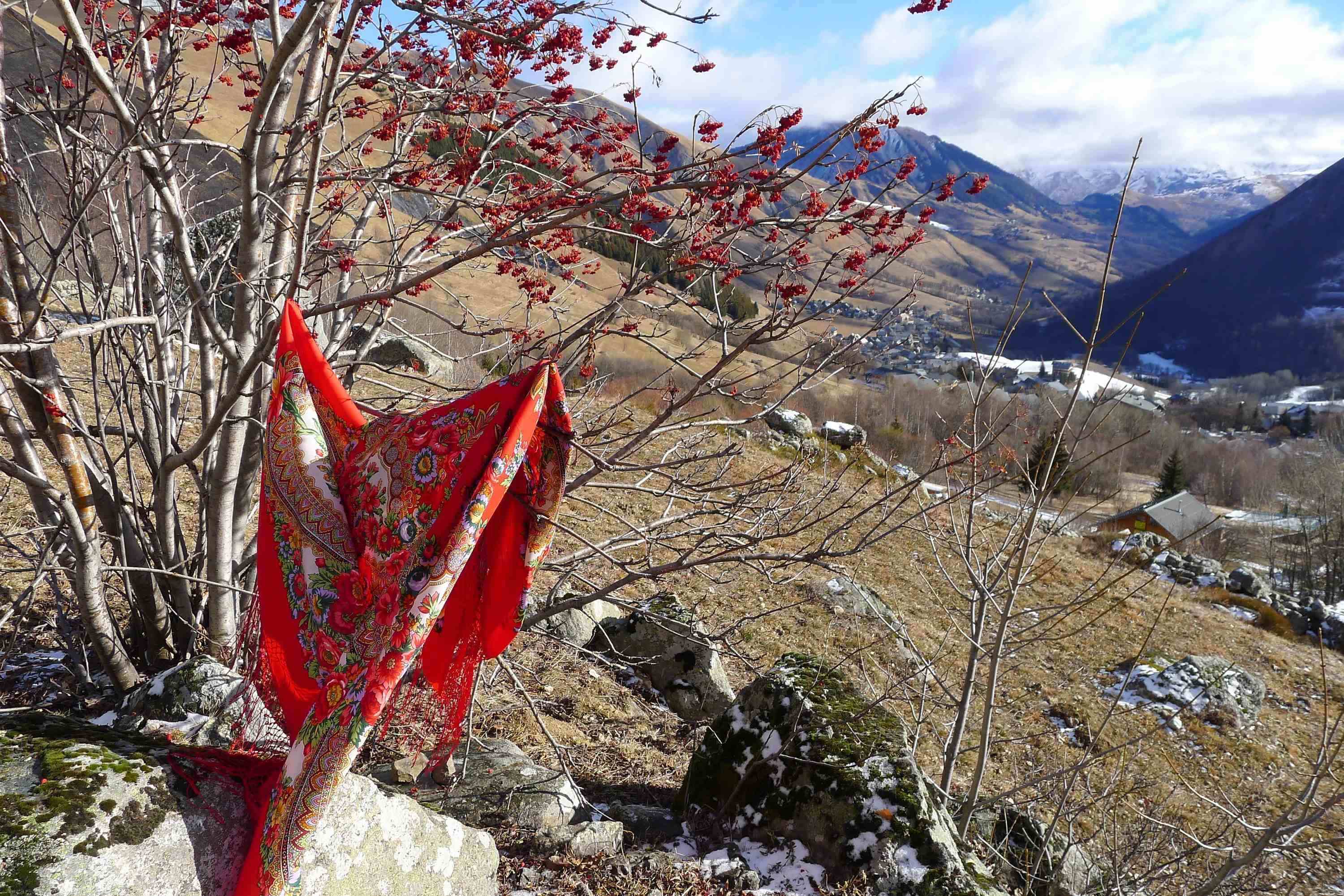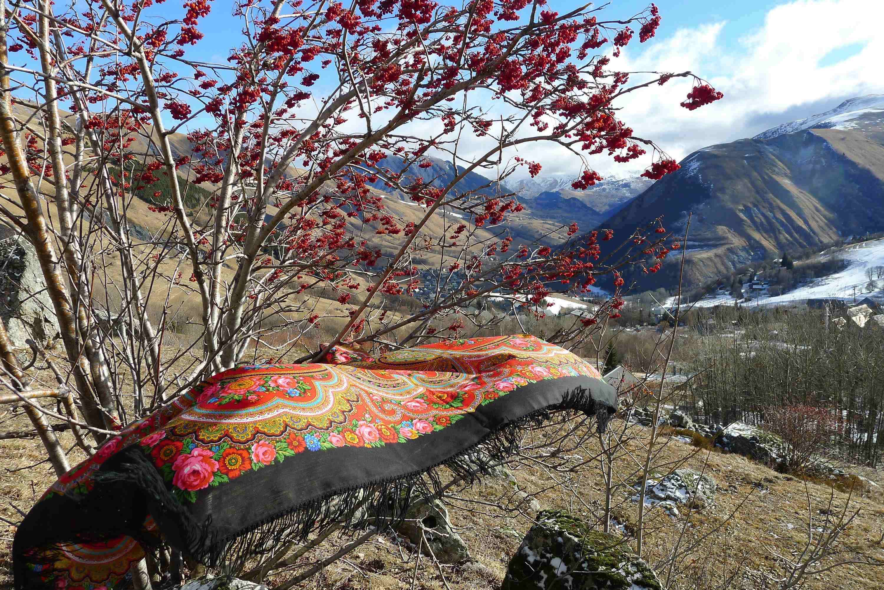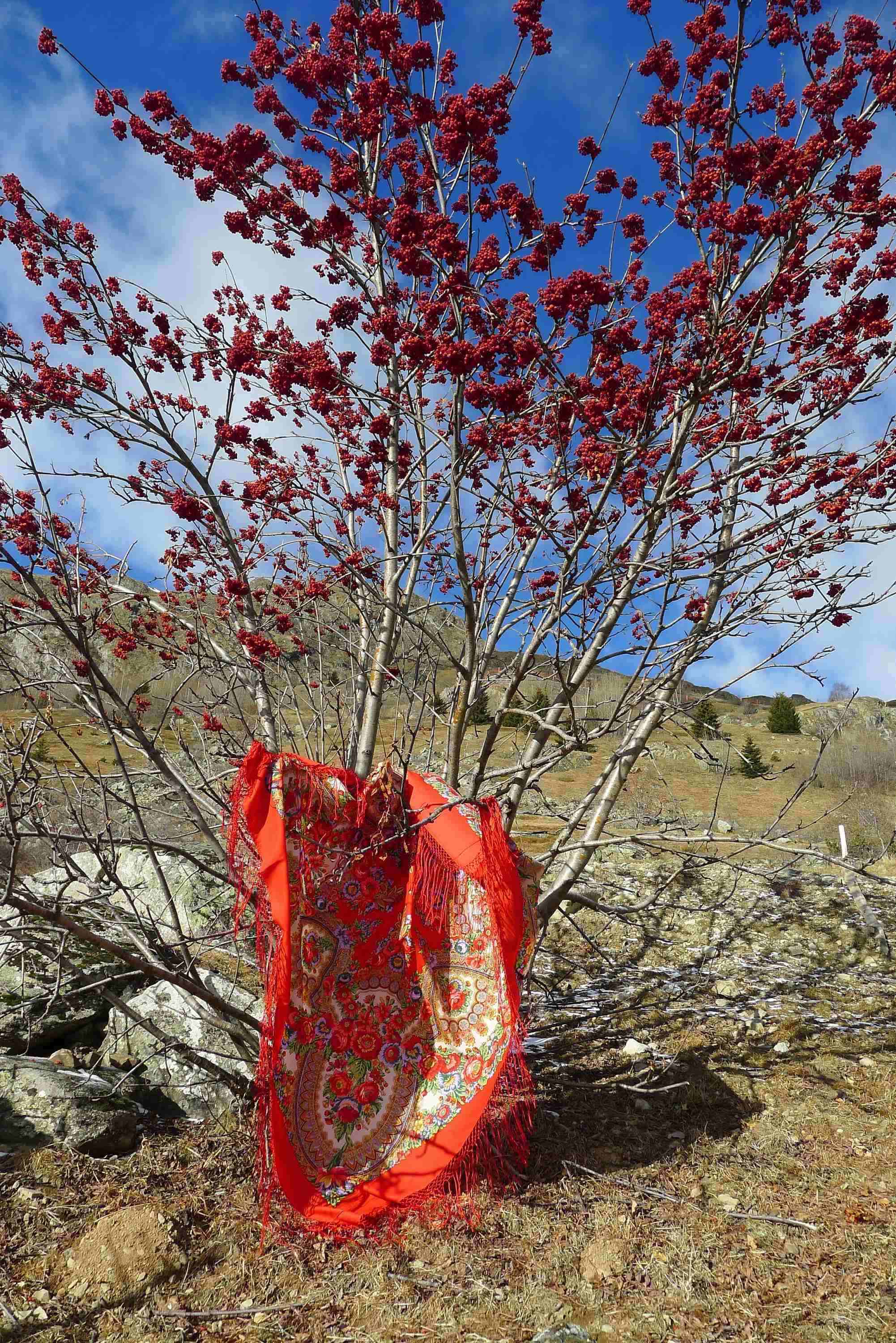 Замерзшие речки, камни и скалы, алые ягоды, синее небо и яркие платки- восхитительное зрелище.
